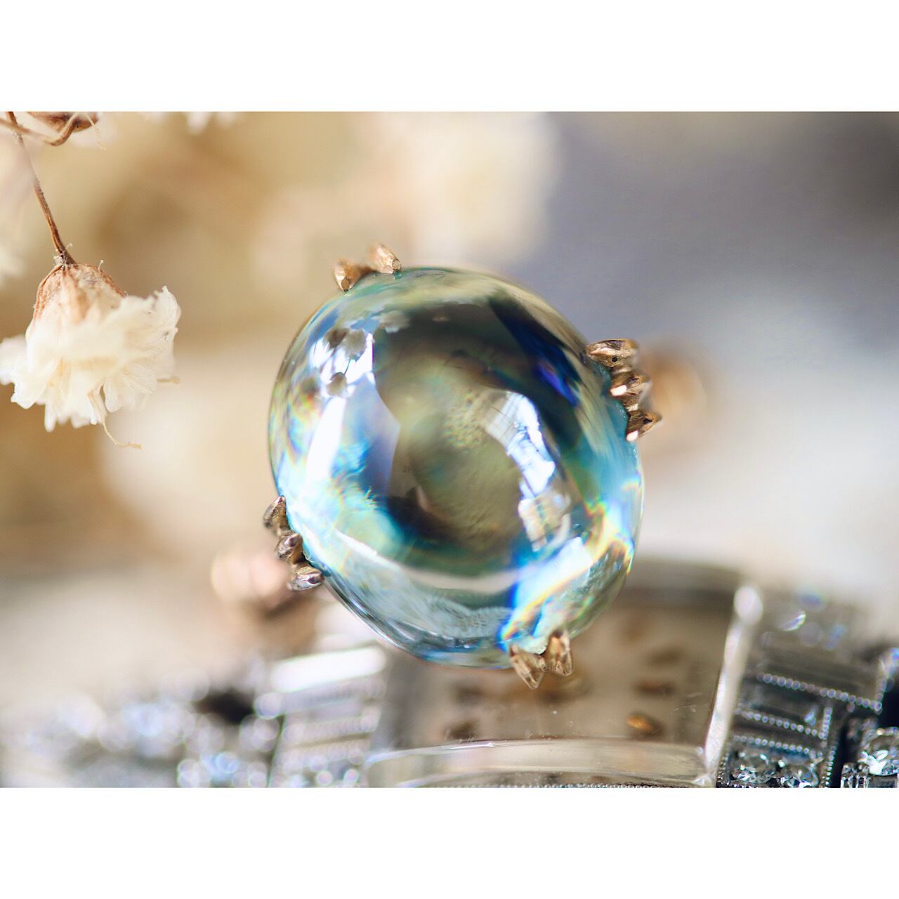 カボションカットのふっくらとした形が愛らしく、まるでシャボン玉を閉じ込めたかのような美しさ。