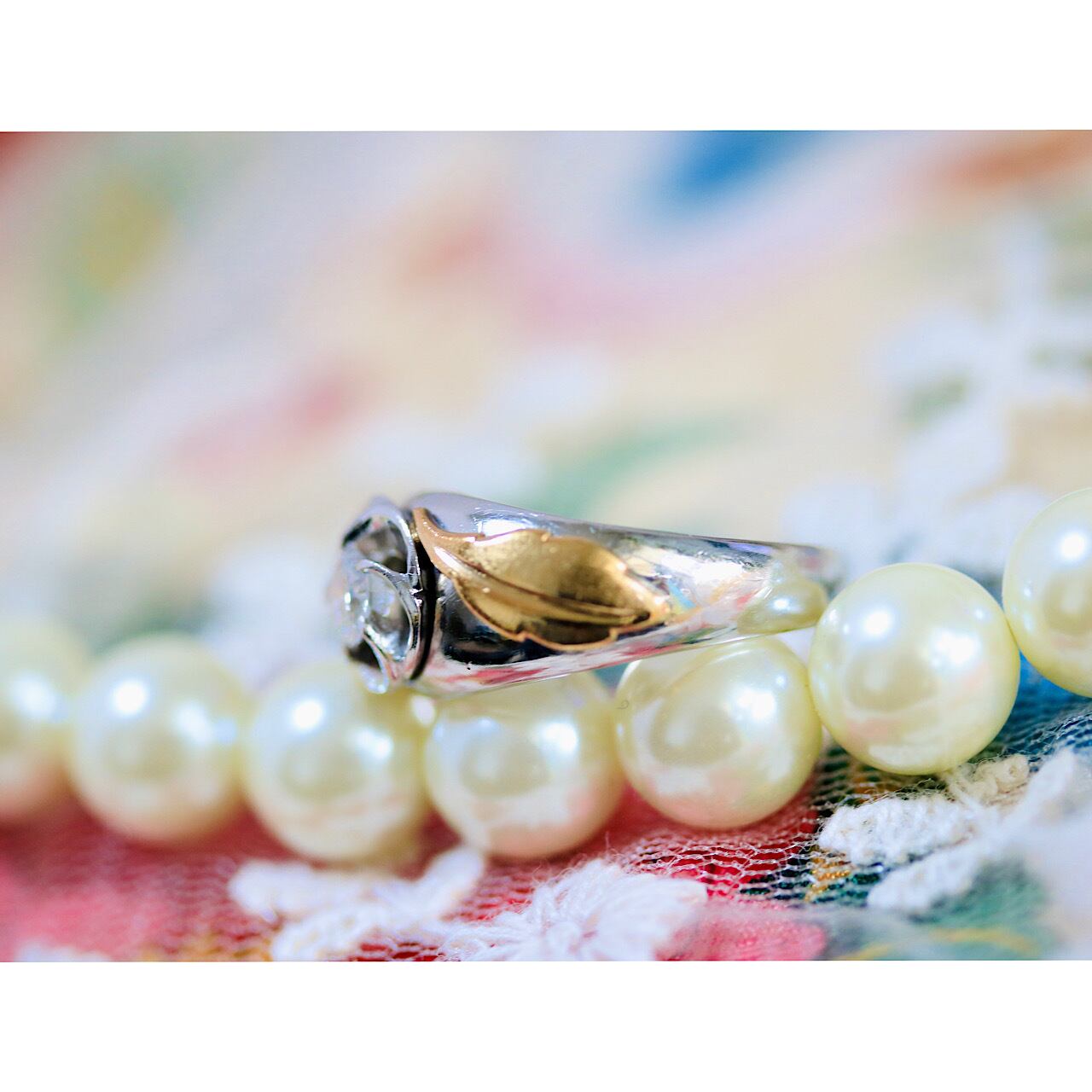 プラチナ900にメインのダイヤモンドの梅の花、サイドにはK20の葉。とても豪華なリングです。
