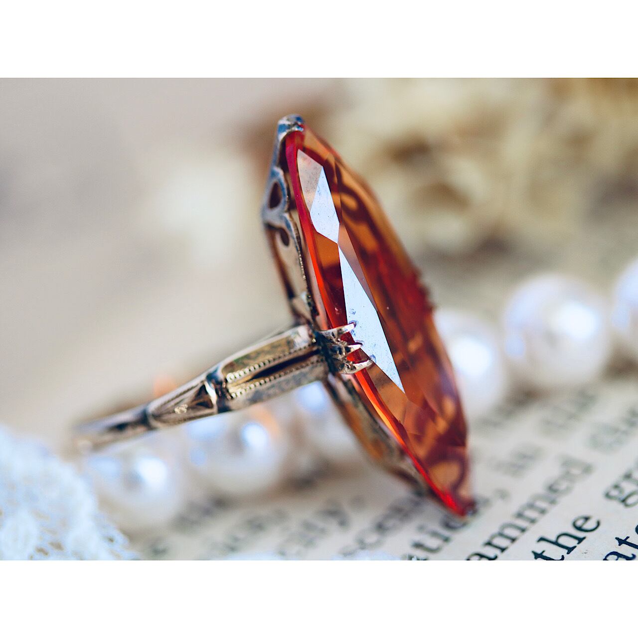 大振りなマーキスカットの合成オレンジサファイアが印象的なリング。
