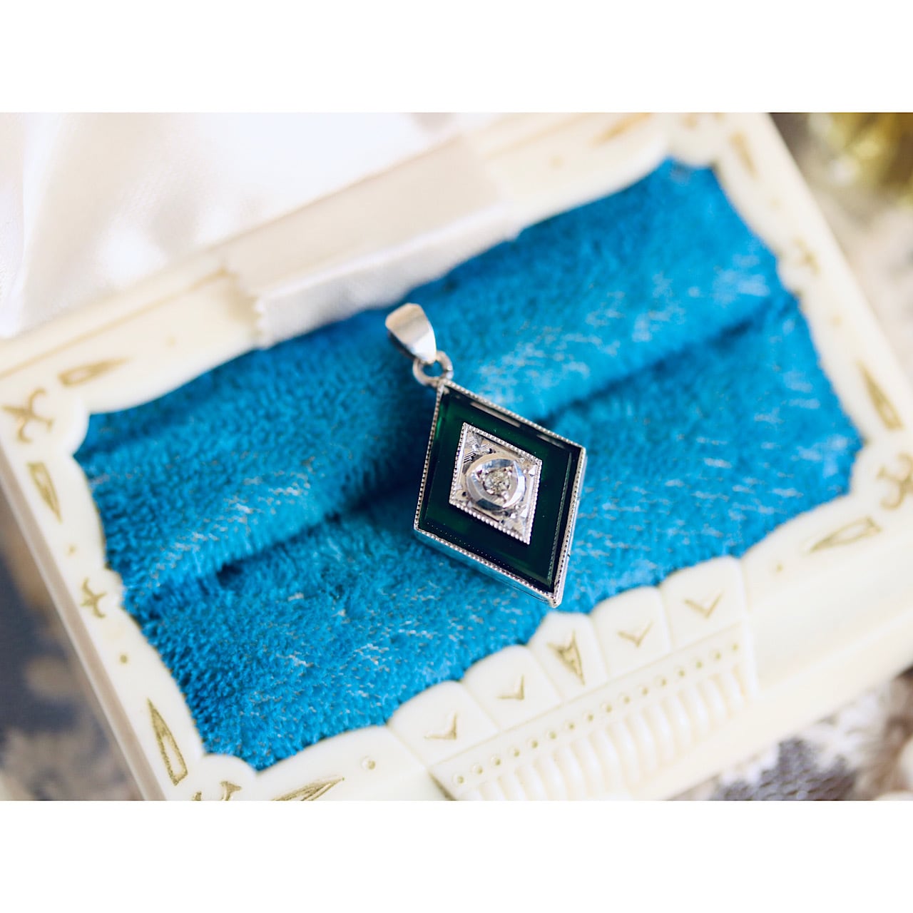 エメラルドを模したグリーンのお石のロケットペンダントです。中心には透明石、その周りには繊細な和彫やミルグレインが素敵です。