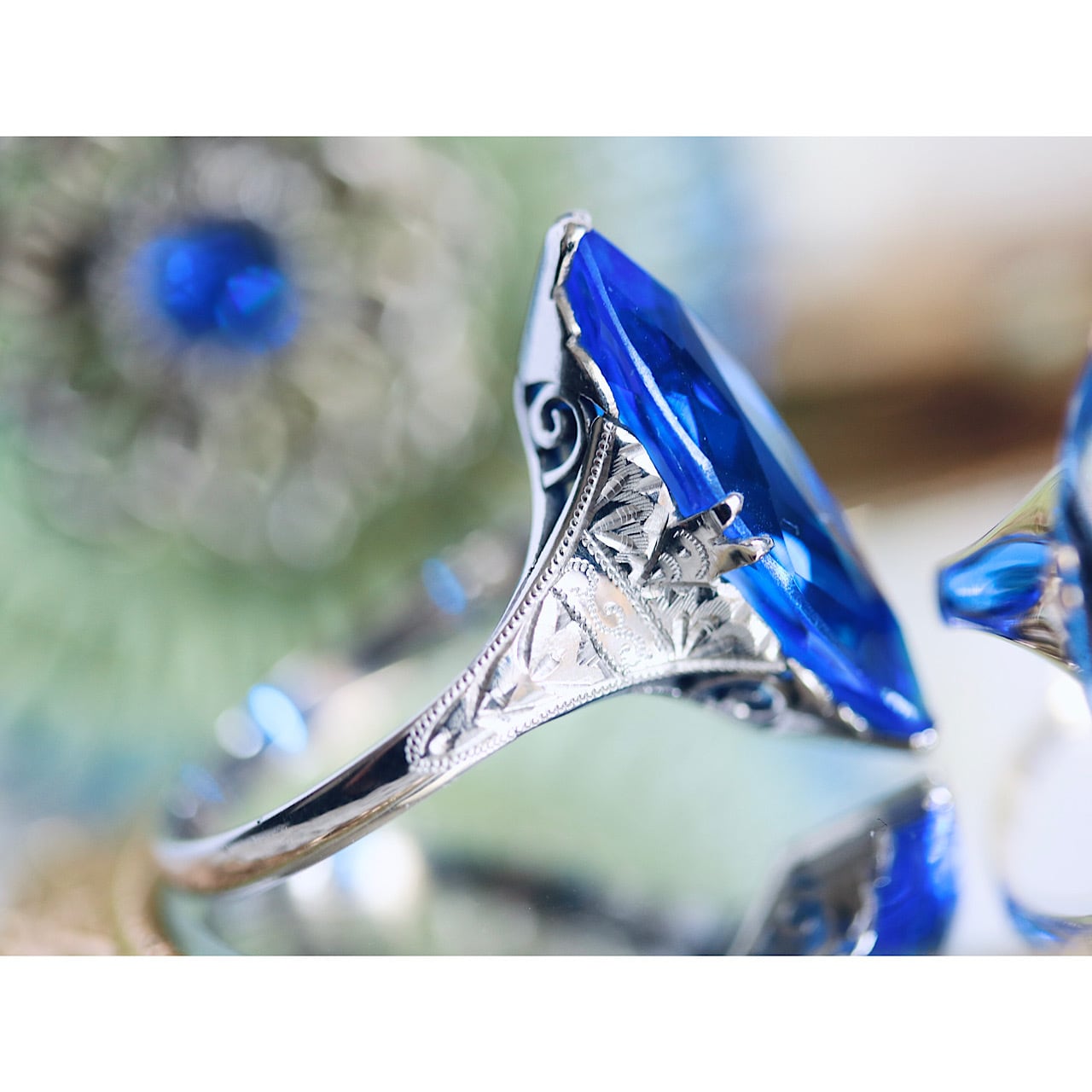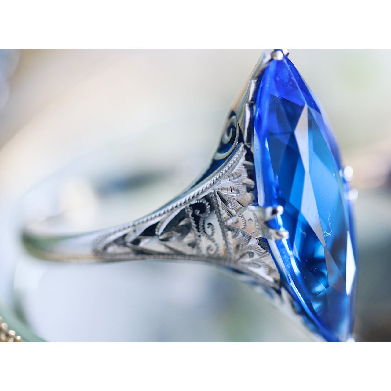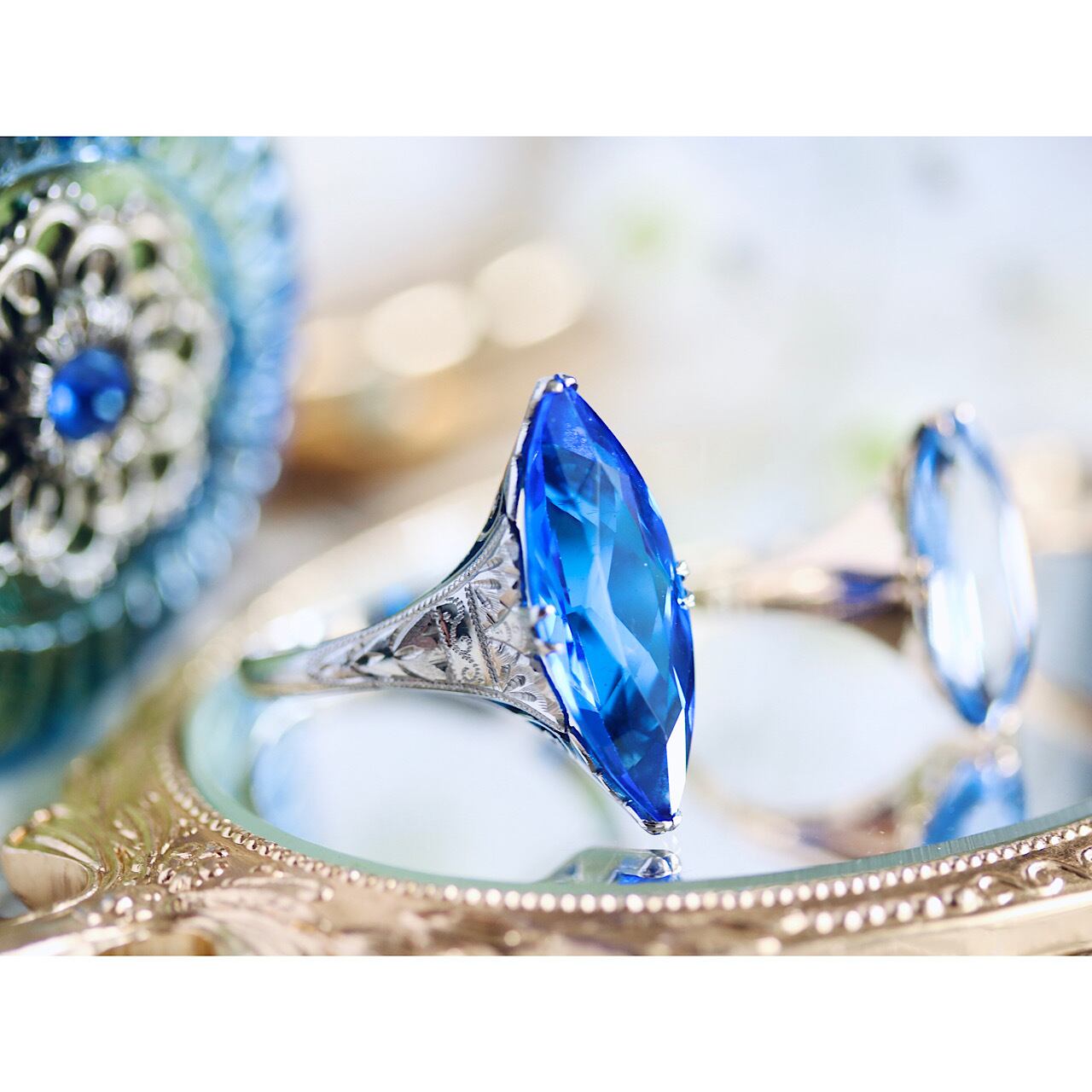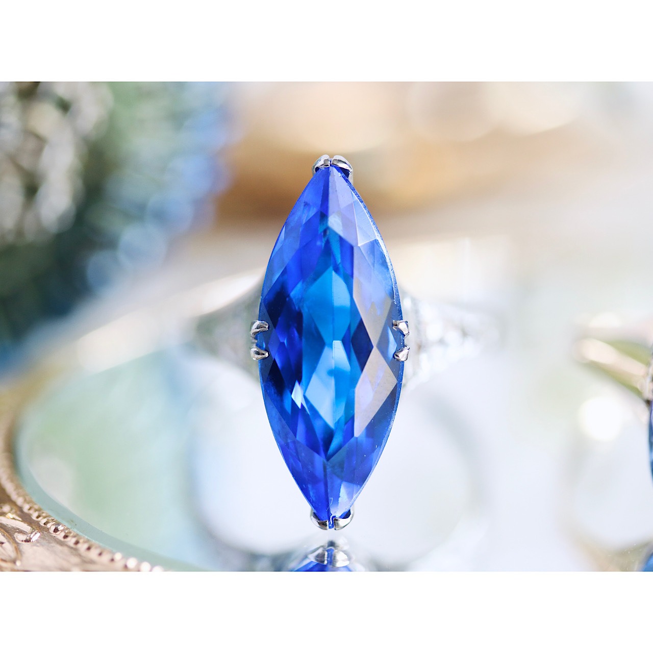 深いロイヤルブルーのマーキスカットのお石が映えるクールで綺麗なリングです。