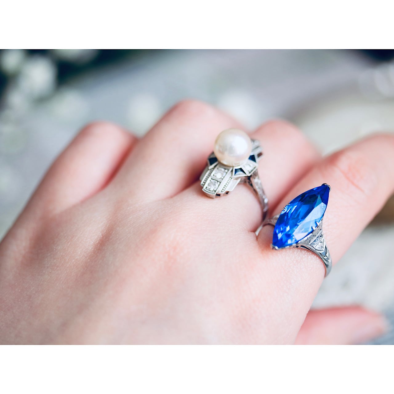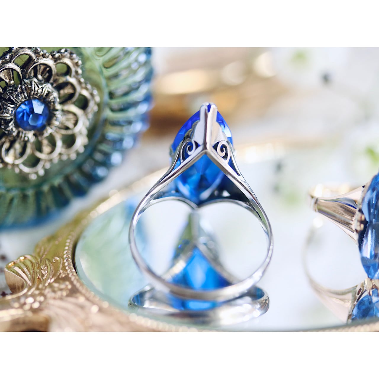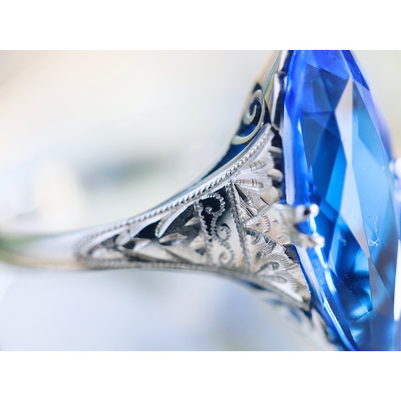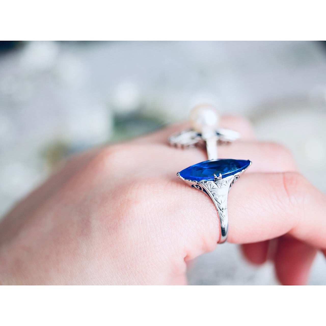 深いロイヤルブルーのマーキスカットのお石が映えるクールで綺麗なリングです。