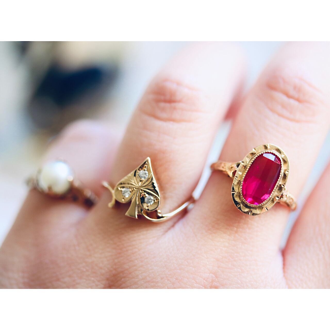 ラズベリーのような色味の合成ルビーと額縁デザインの組み合わせが乙女感全開なリング。