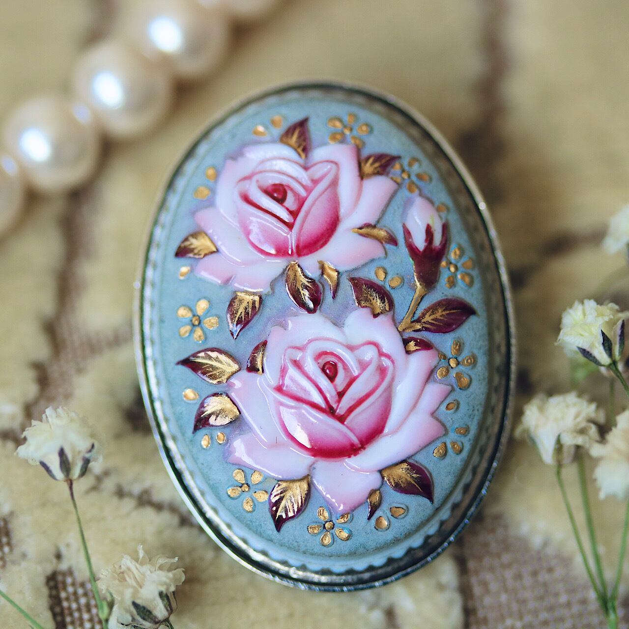 ぷっくりしたツヤツヤ感のある薔薇はピンク色のグラデーションが美しく目を引きます。その周りも大変緻密に描かれていますのでご覧下さい。