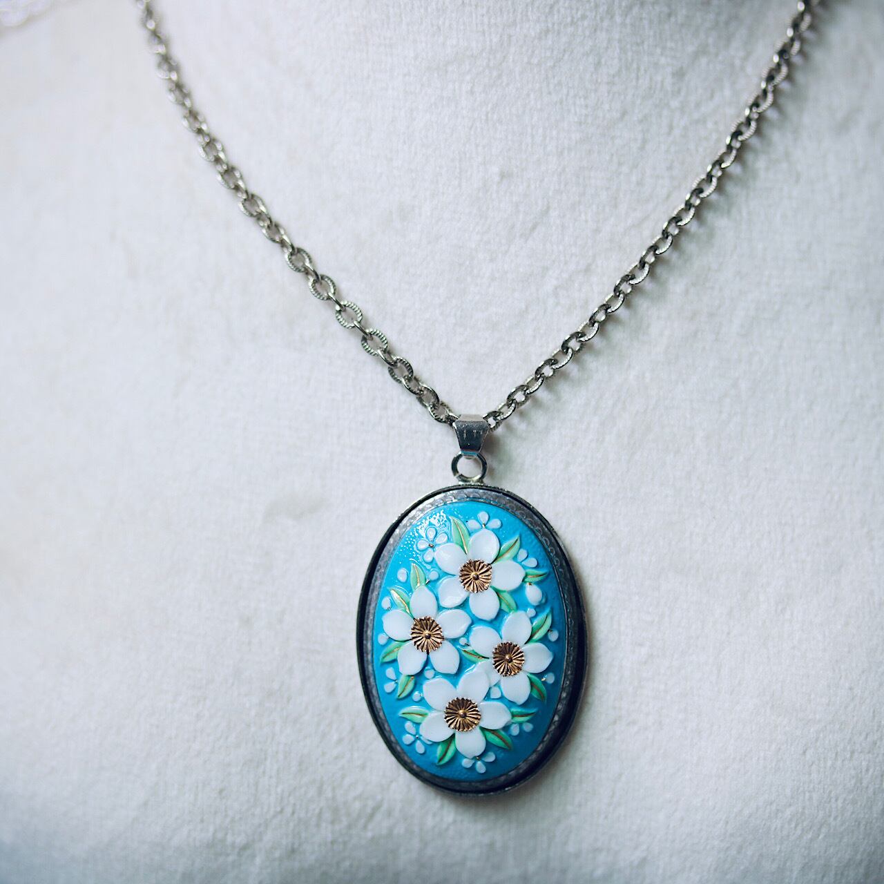ペンダントトップは爽やかなブルーに清楚な白いお花でトシカネらしい夏にぴったりのデザイン。やはり陶磁器製とは思えない程の発色、緻密なデザインが素晴らしいお品です。