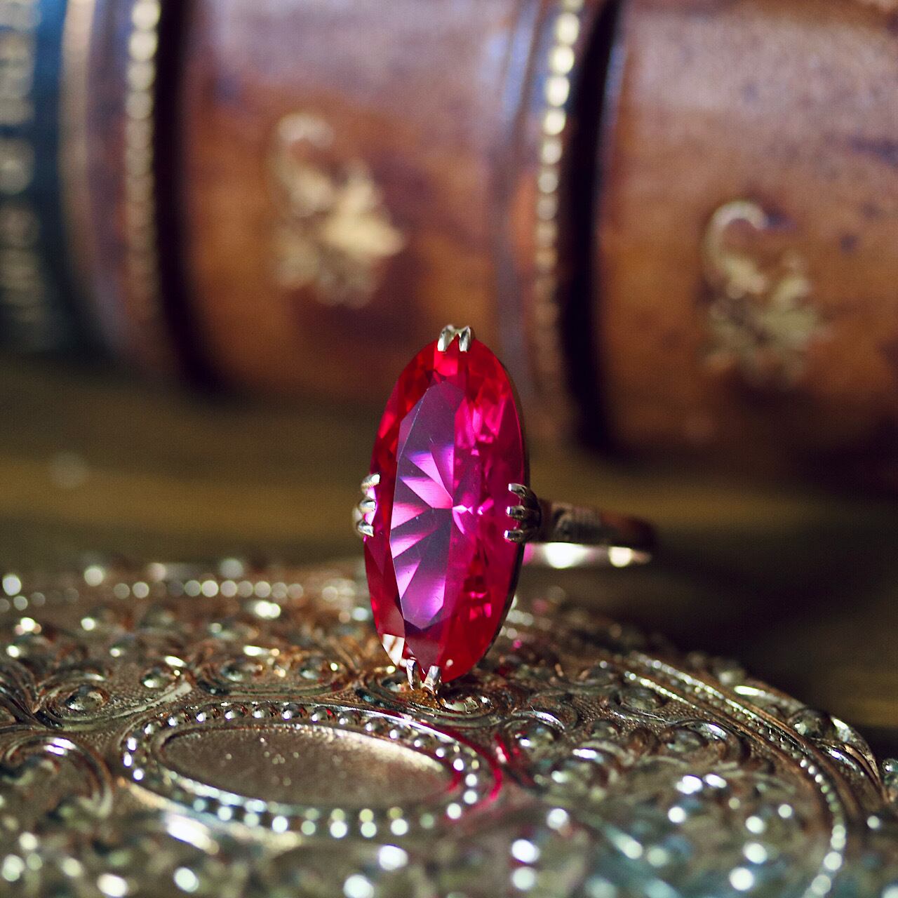 ごろっとした美しいベリーピンク色の大きな合成ルビーが目を引きます。