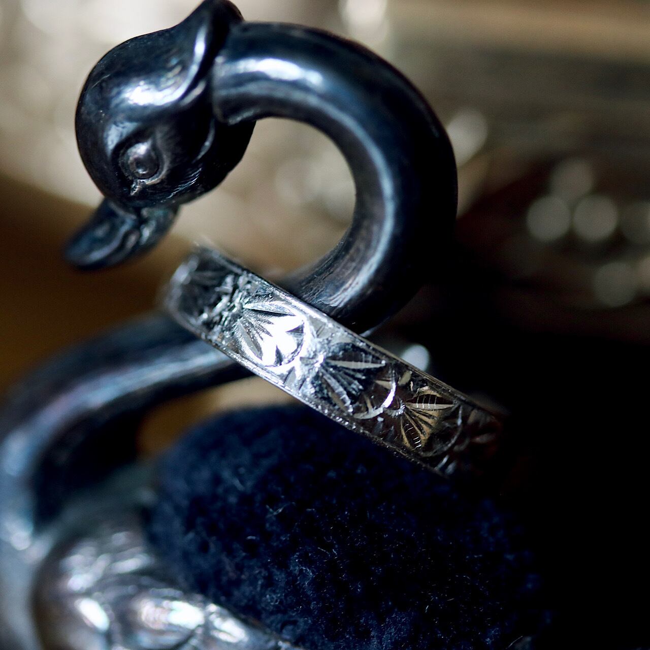 レースのような和彫が美しいプラチナ製平打ち地金リング。