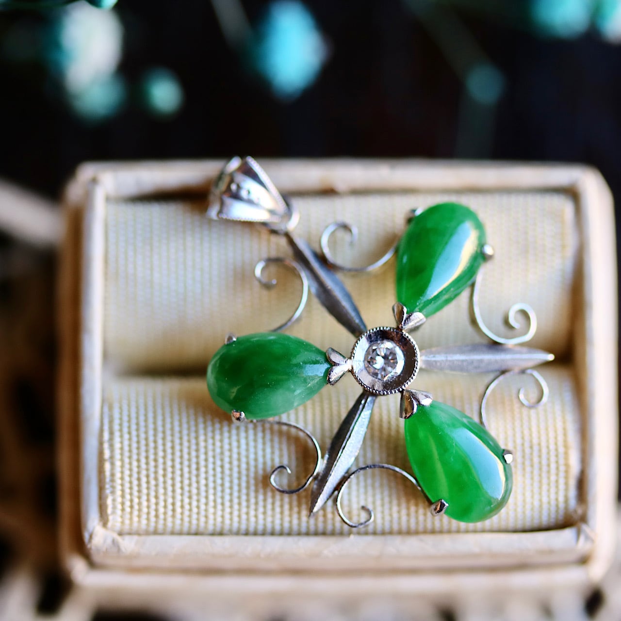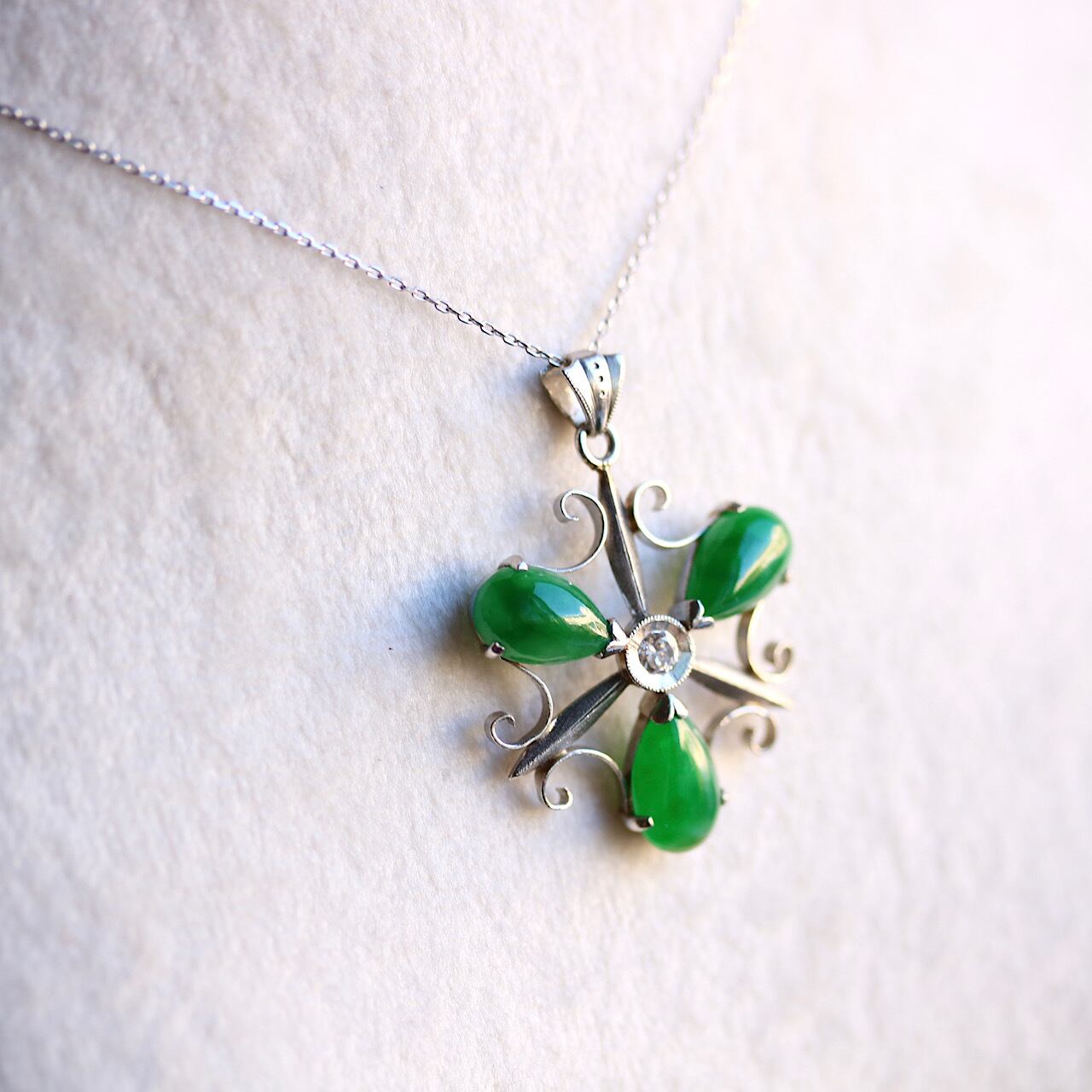 プラチナ製 翡翠と天然ダイヤモンドのアールデコのペンダントトップ。