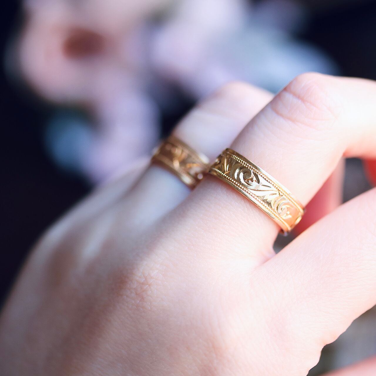 上品なゴールドの輝きが魅力の18金製の平打ち和彫の地金リング。