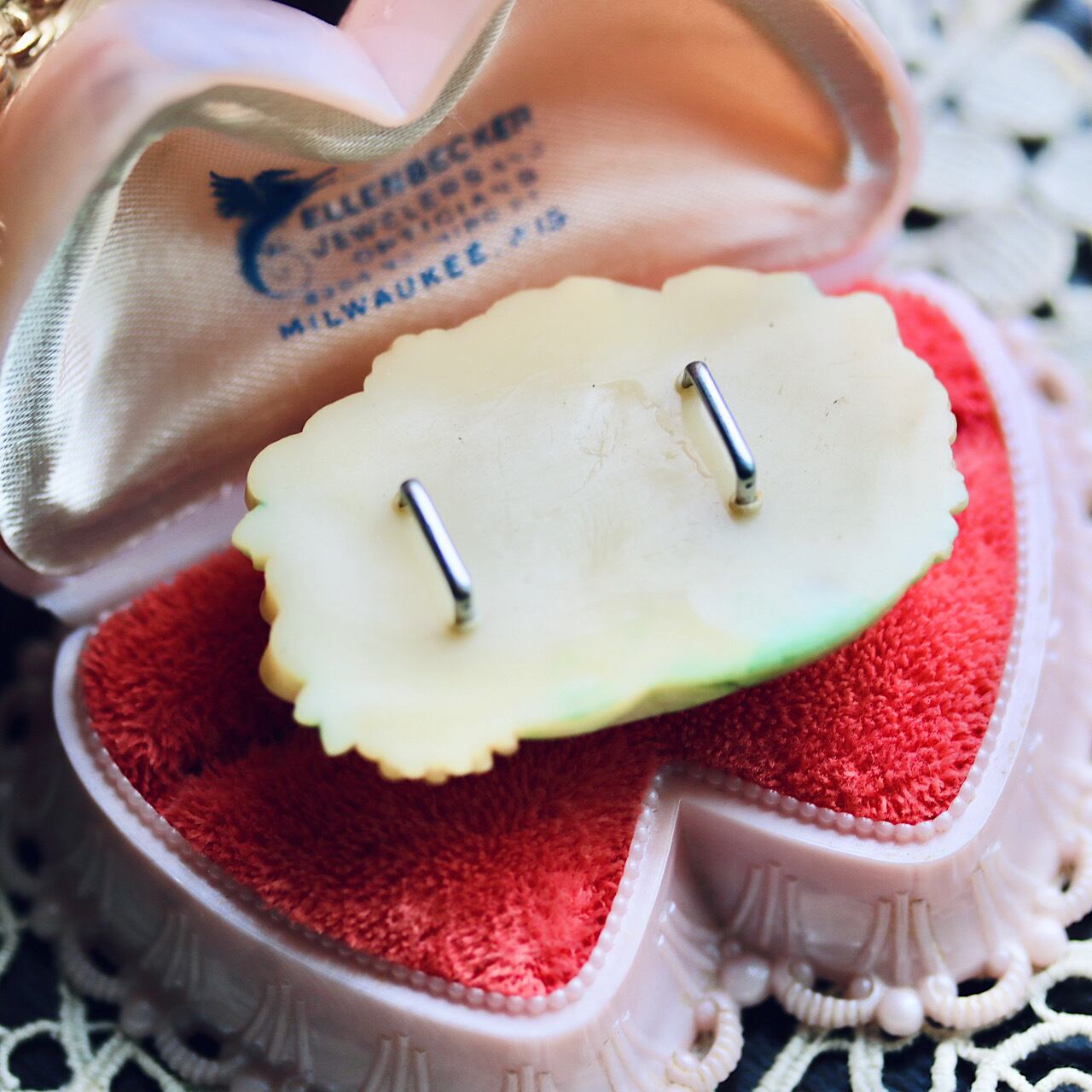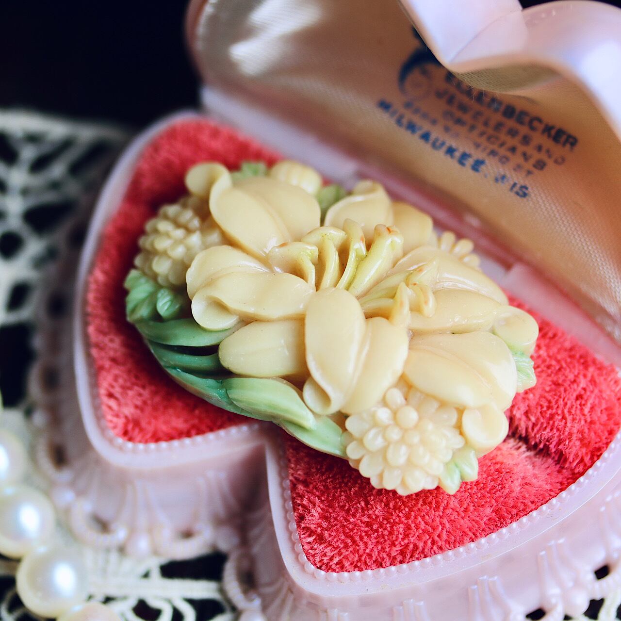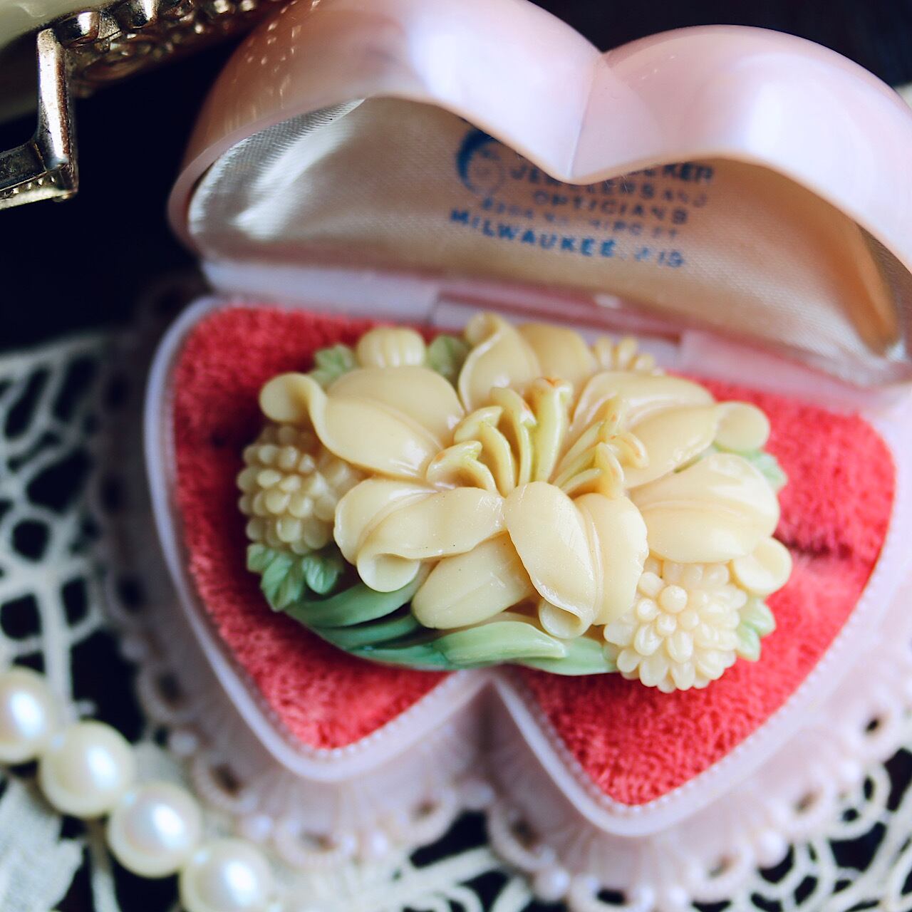 アンティークのセルロイドアクセサリーは海外向けに作られた物が多いのか、帯留に加工された物は殆ど見かけないように思います。