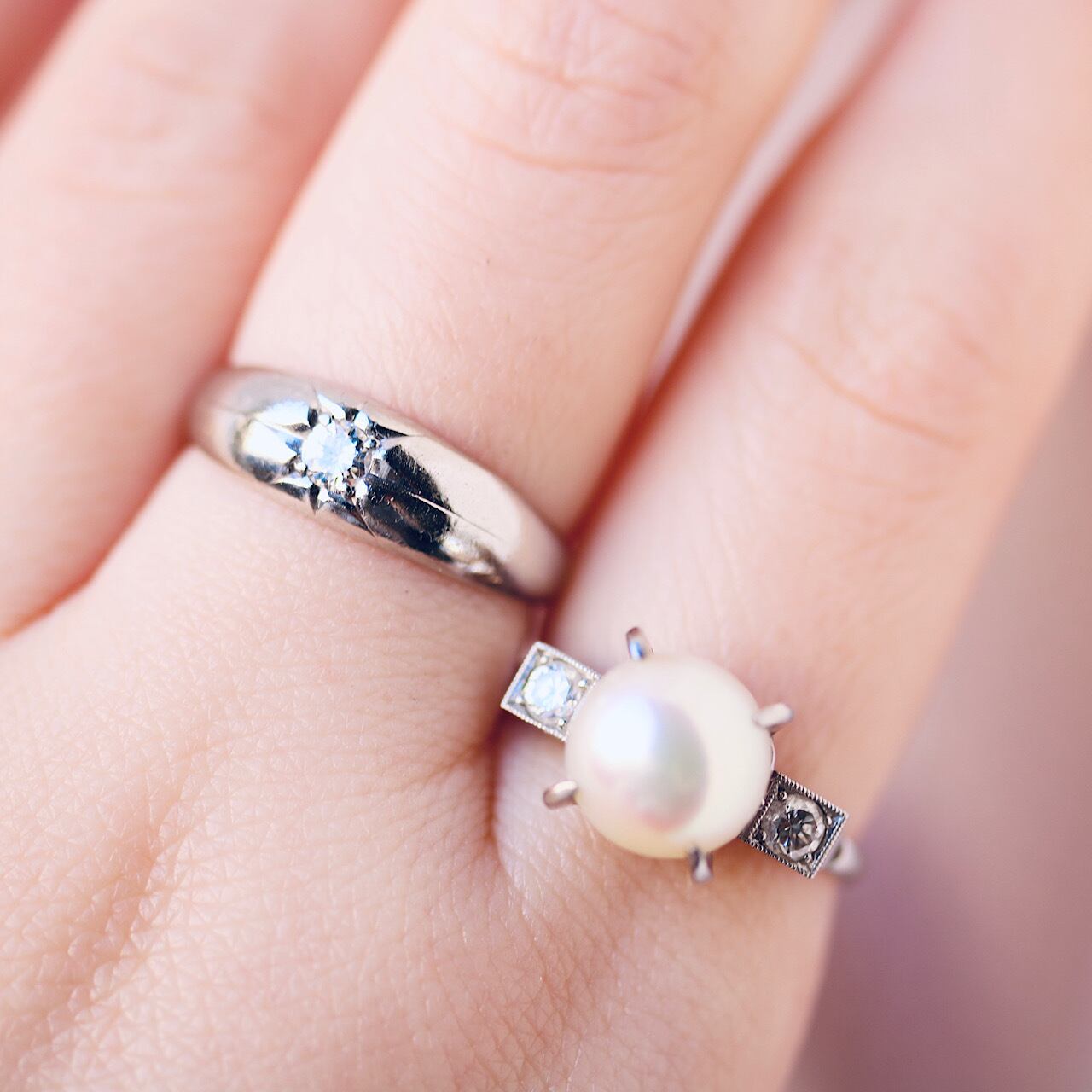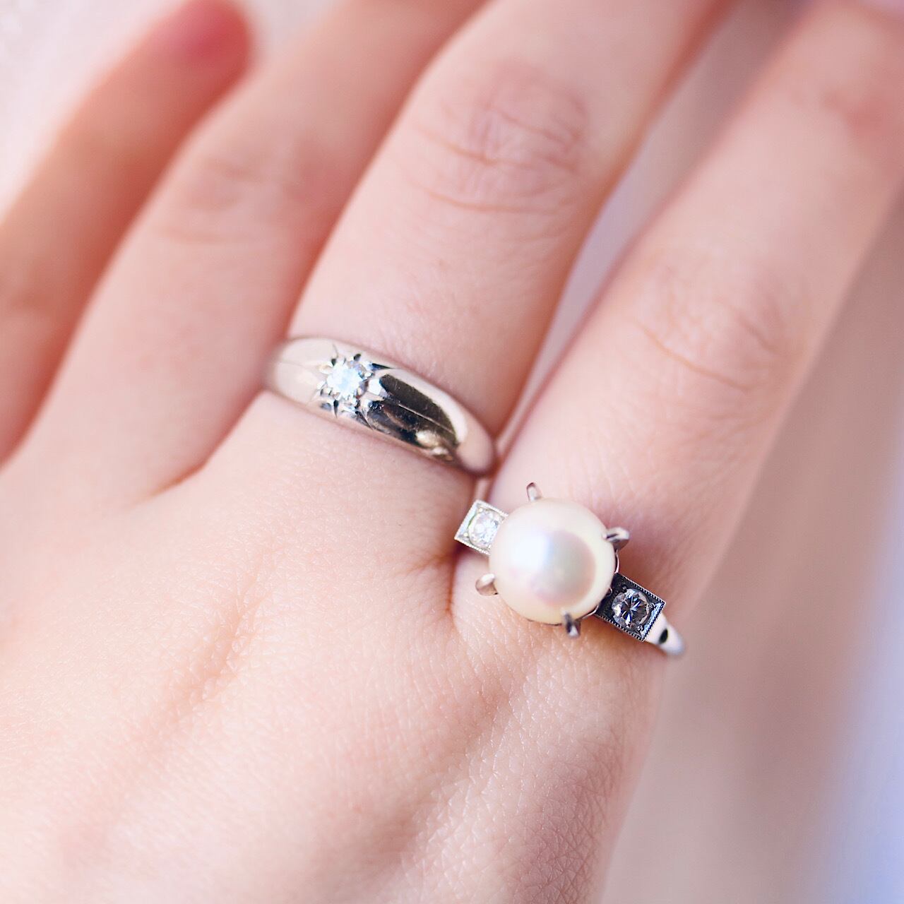 プラチナ製ダイヤモンドと一粒パールのヴィンテージリング。