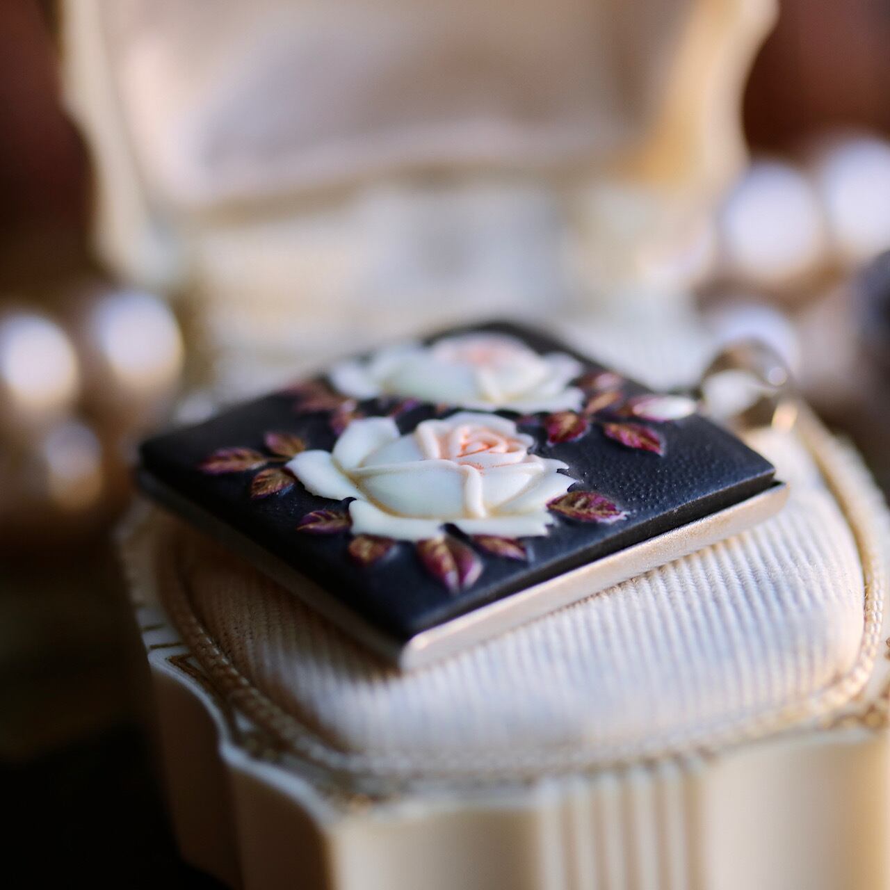 アンティークの雰囲気漂う白薔薇の俊兼ペンダントトップ。