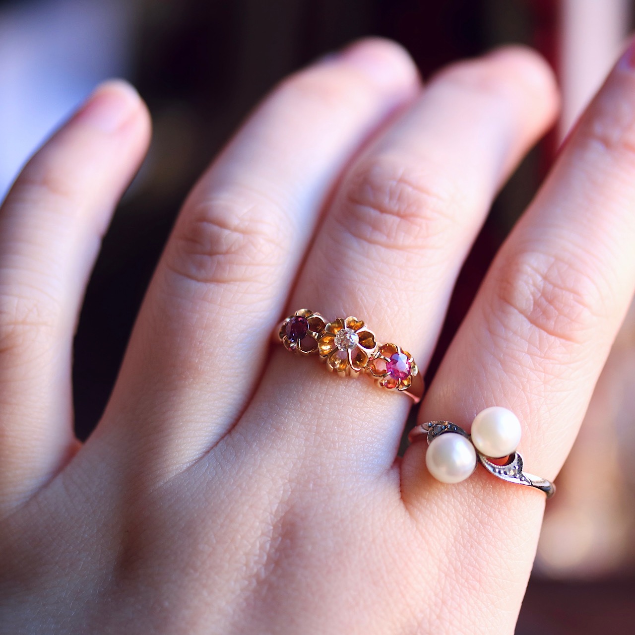 左右のルビーにはやや色味の違いがあり、チェリーピンクとパープリッシュピンクの鮮やかな発色の石がセッティングされています。