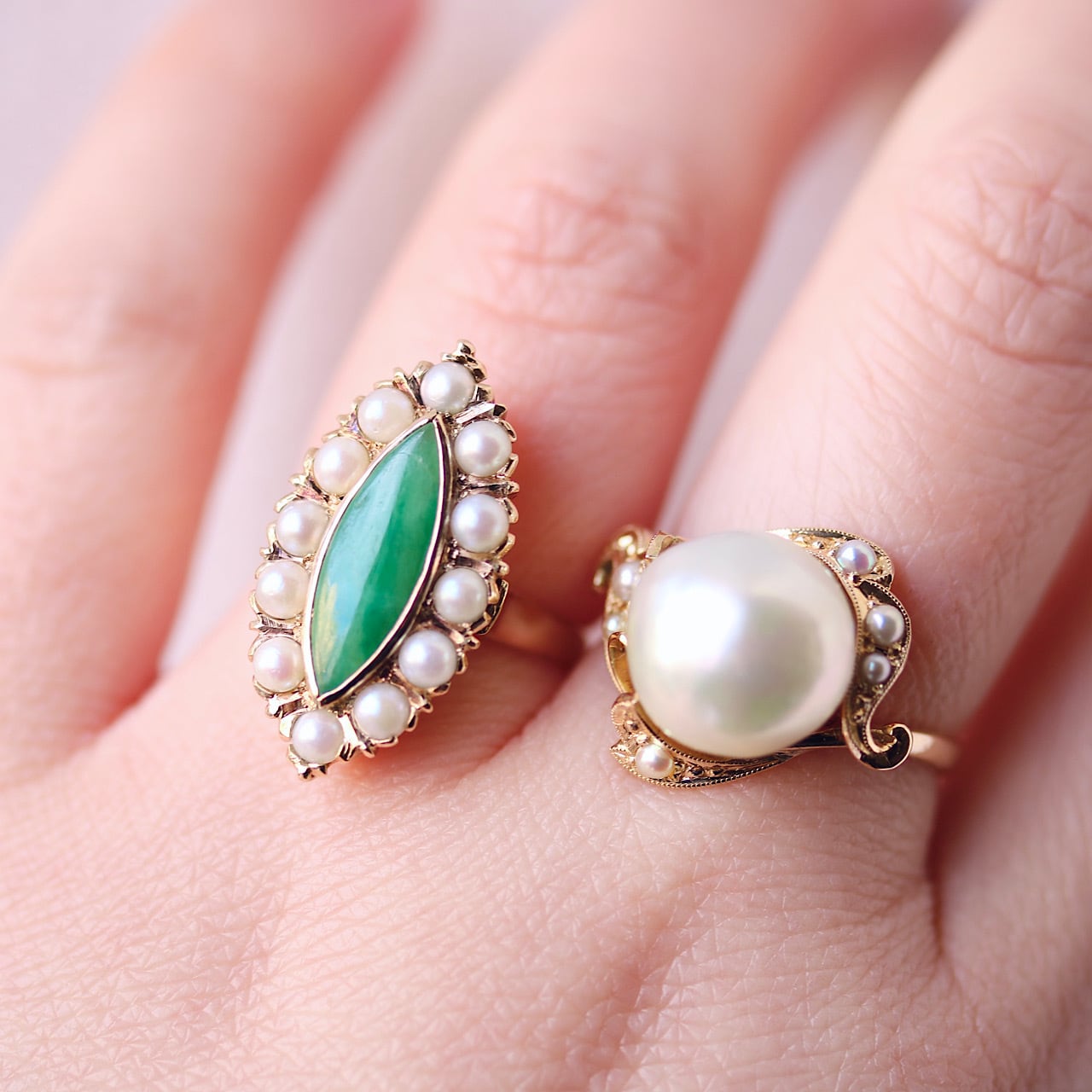 緑色の翡翠と真珠の組み合わせが甘く、上品さと可愛らしさを兼ね備えたヴィンテージリングです。