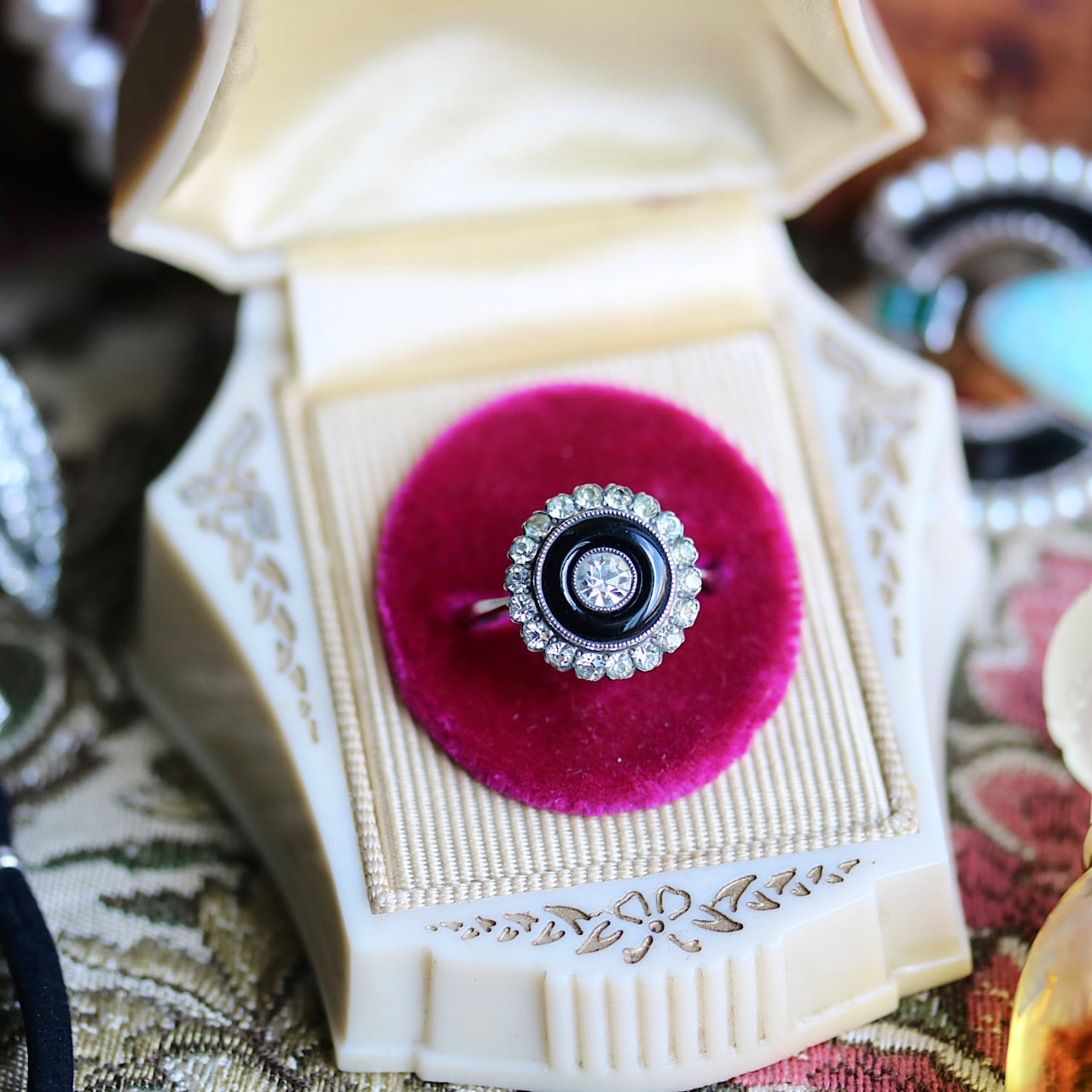 オニキスに透明石のコントラストが美しい、サンプラチナ台のアールデコリング。