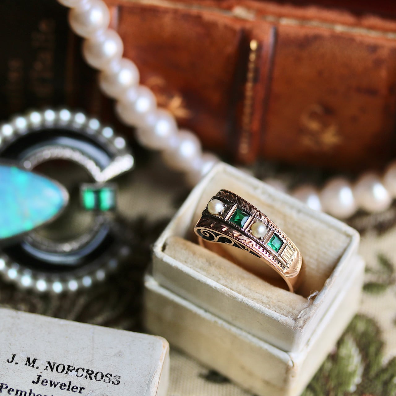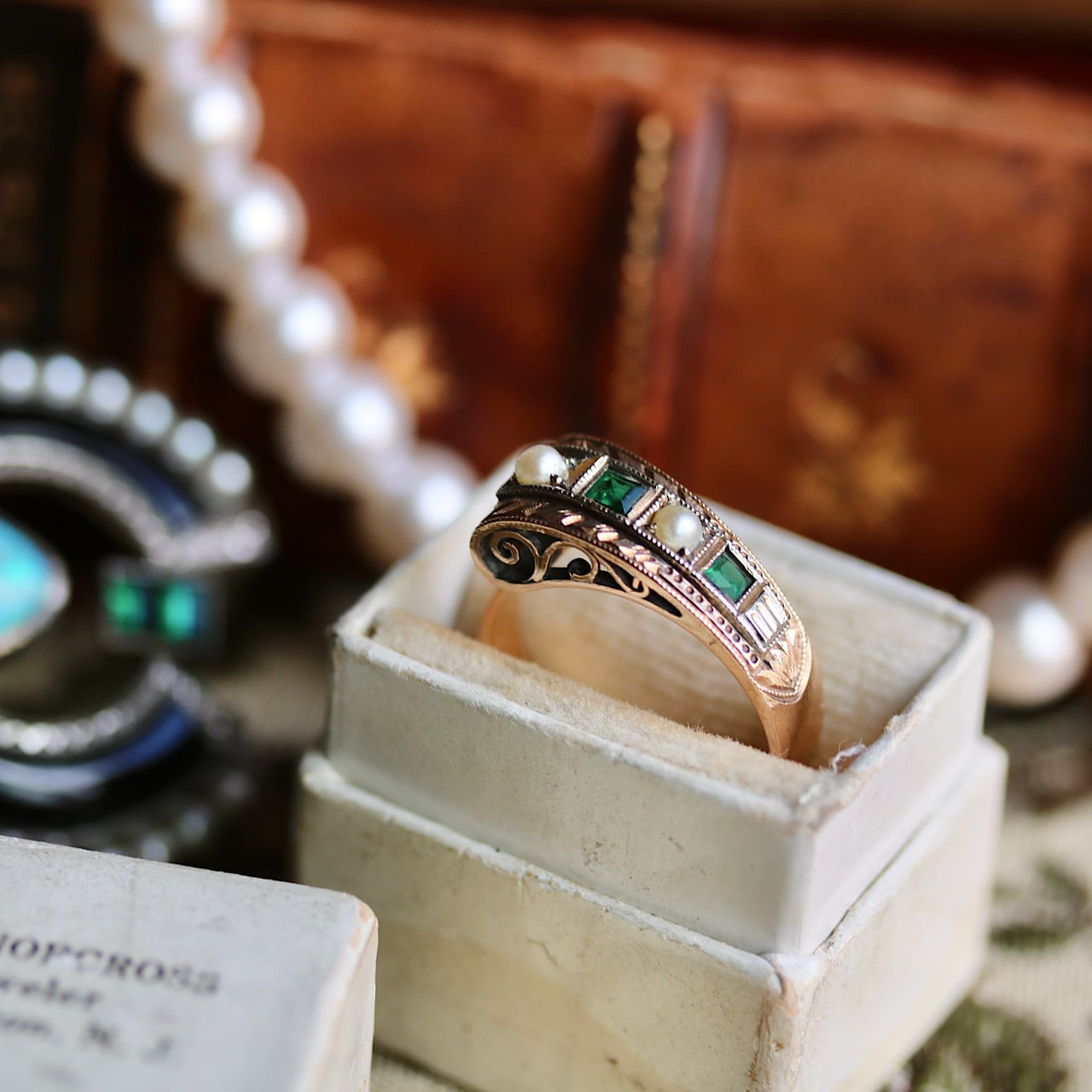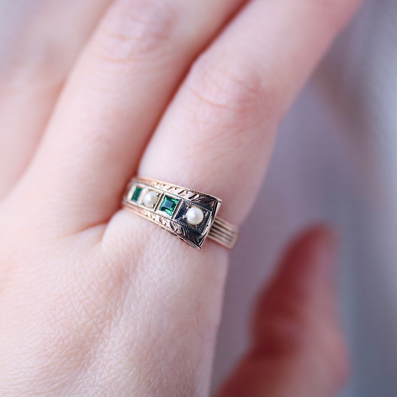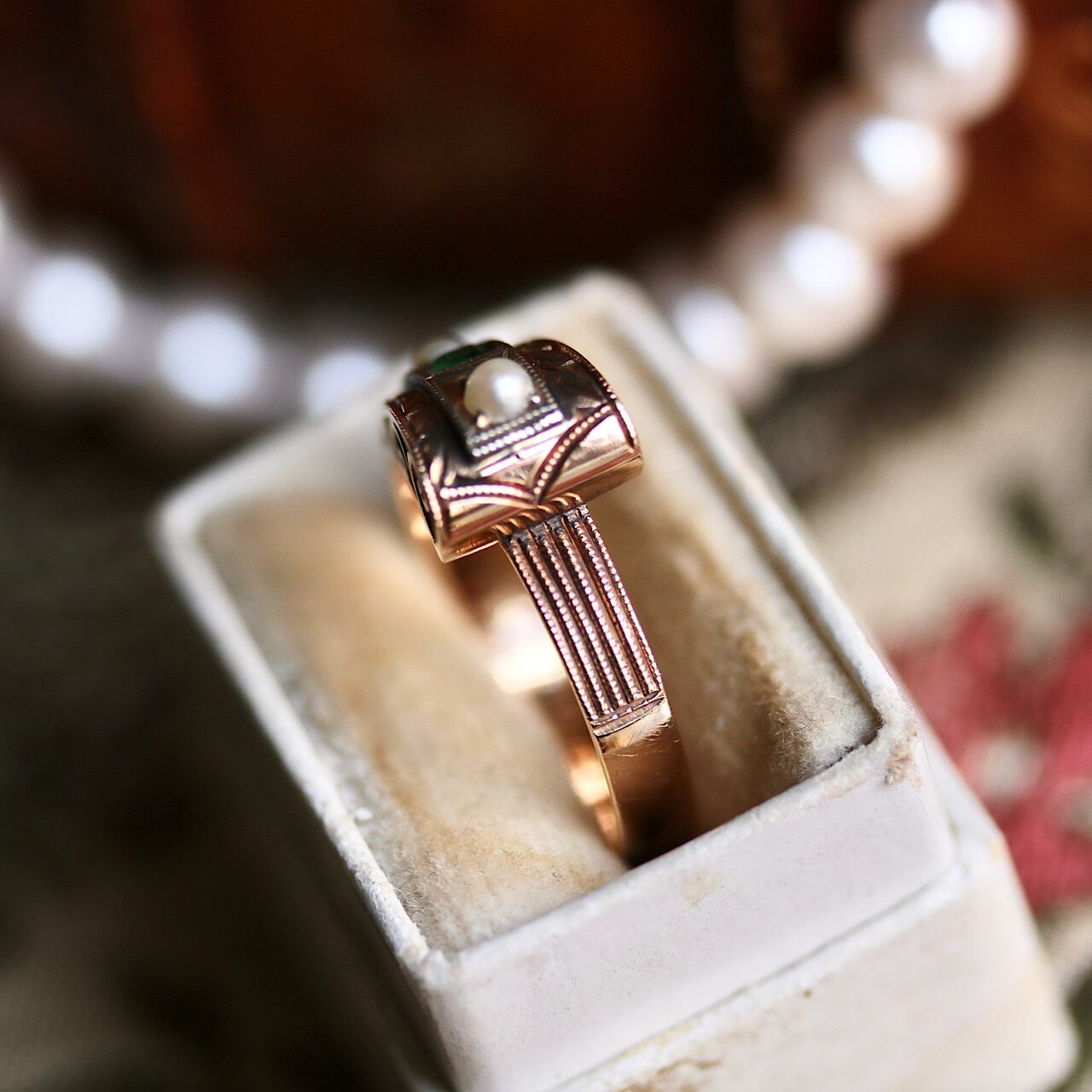 写真では分かりづらいですが、パールと緑石を縁取るスクエアの部分はWG張りのニ色金になっています。