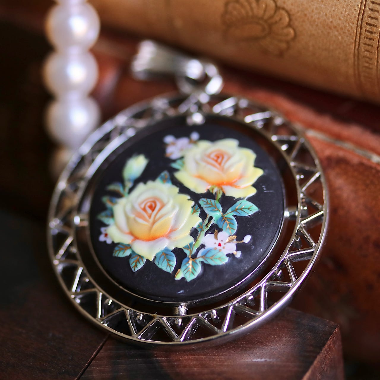 アンティークの雰囲気漂う、淡いオレンジ薔薇の俊兼ペンダントトップ。