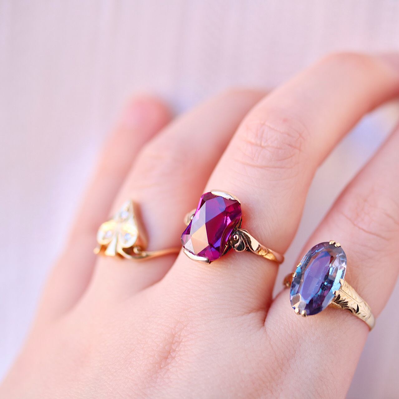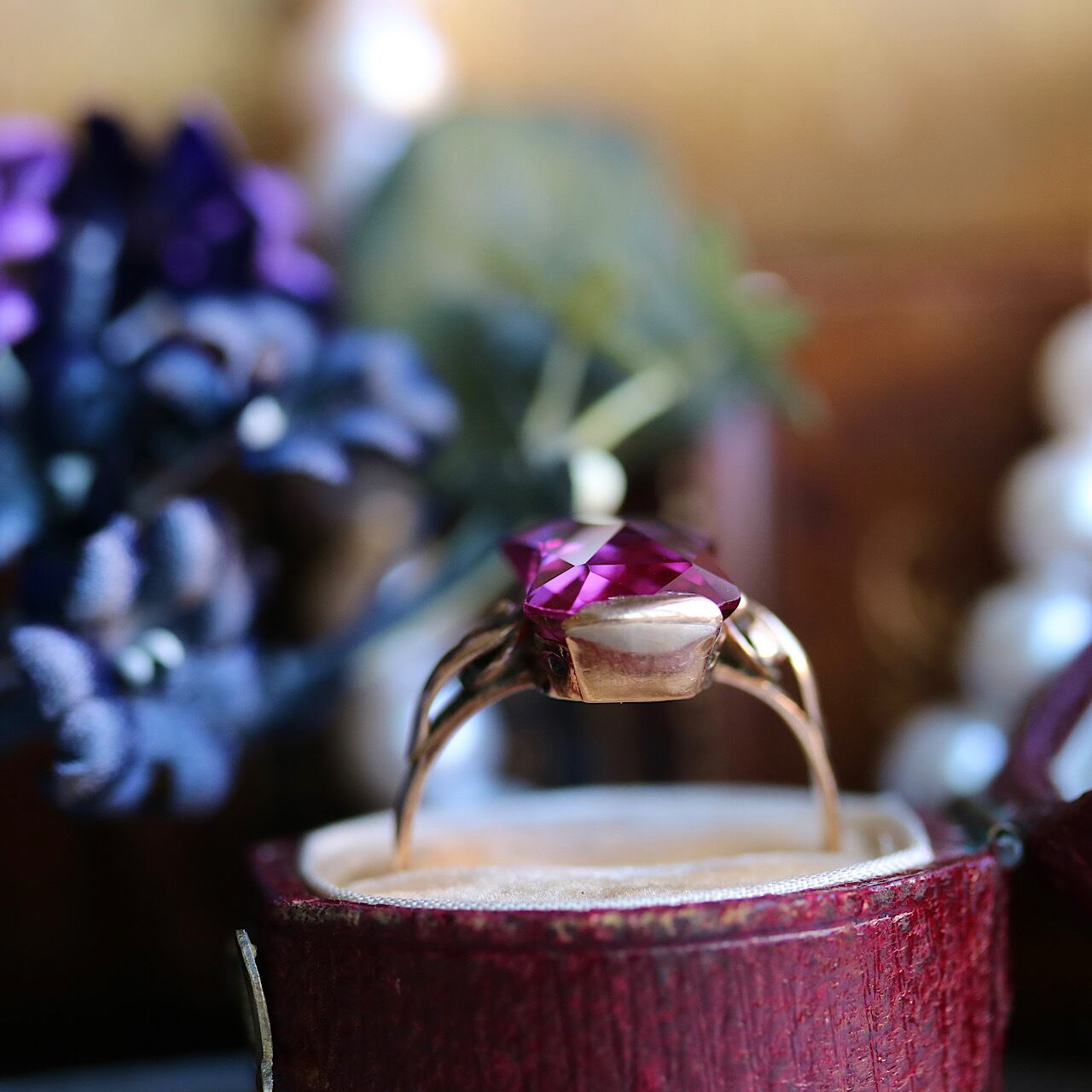 個性的な合成パープルサファイアのK18ヴィンテージリング。
