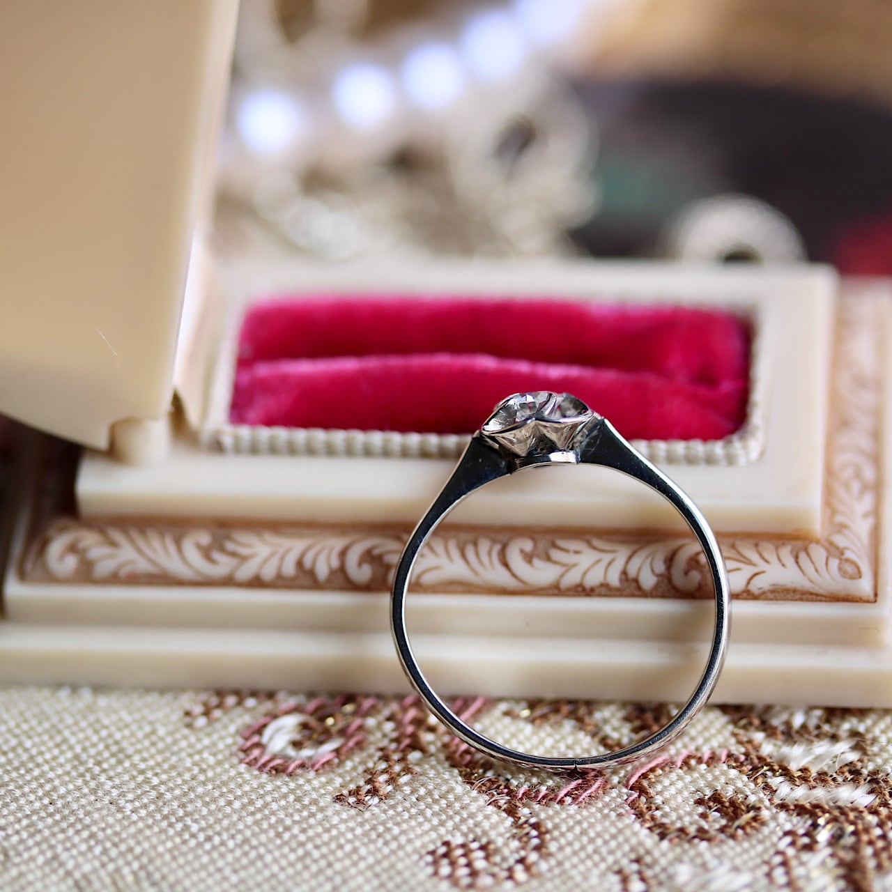 真実はわかりませんが、宝石の使用を禁止されている中、こっそりと製作されたリングなのかと、想像が掻き立てられます。