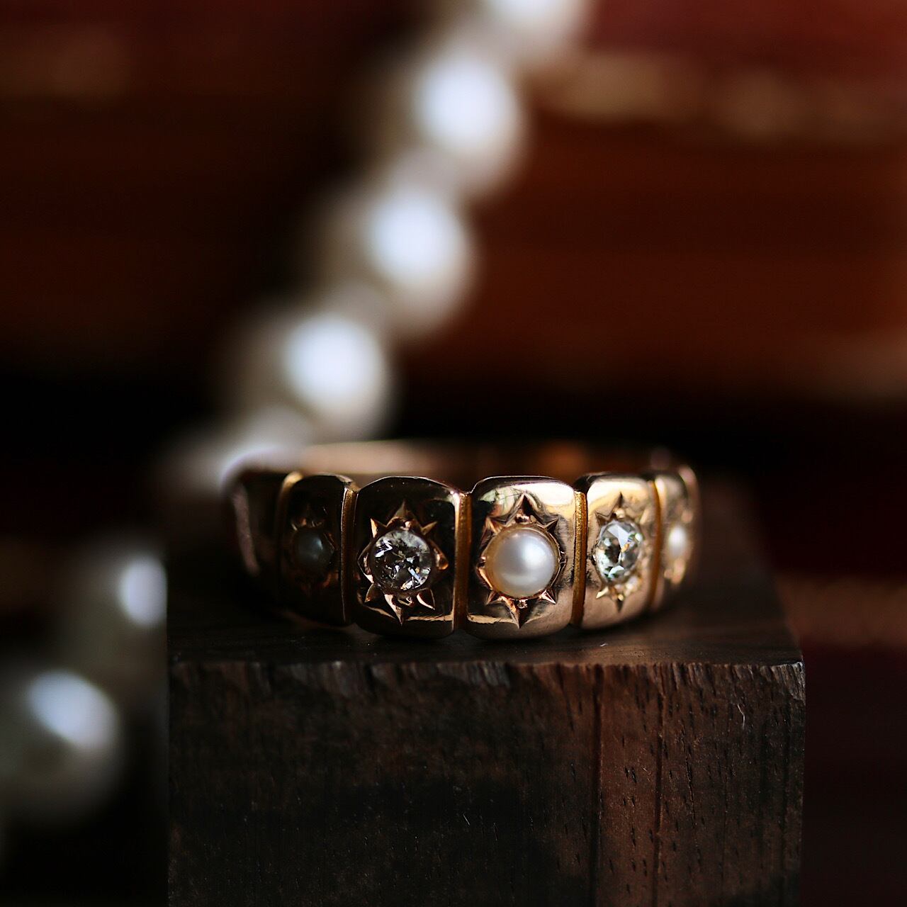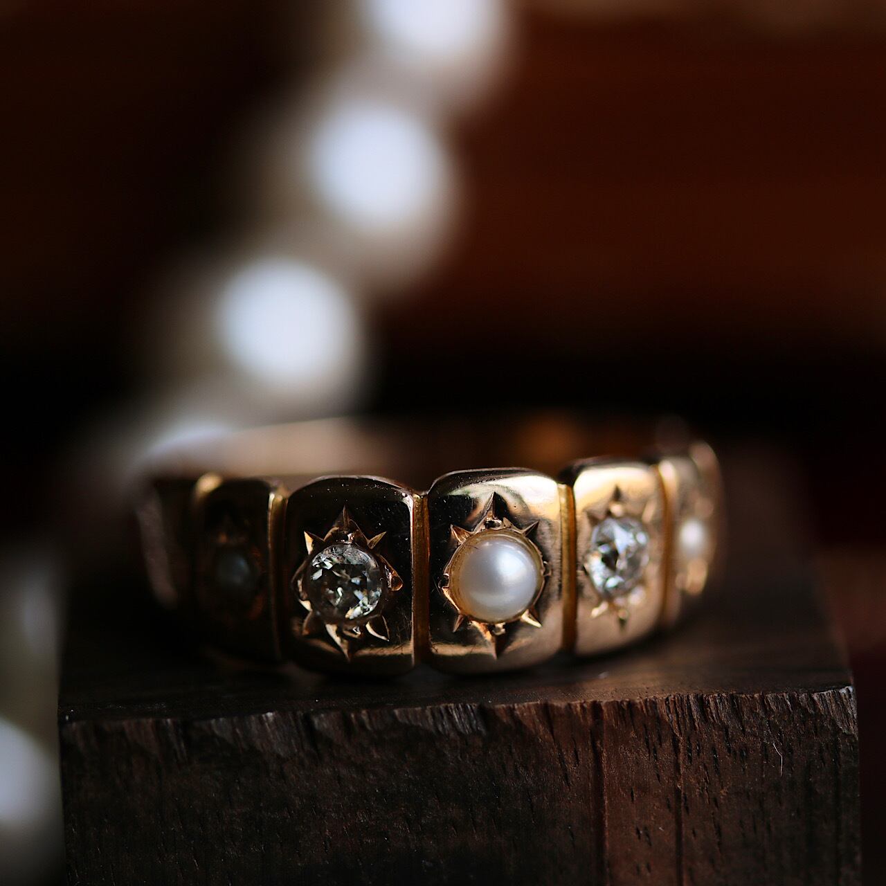 アンティークカットのダイヤモンドとパールが交互に配置されたアンティークの定番とも言えるジプシーリング。