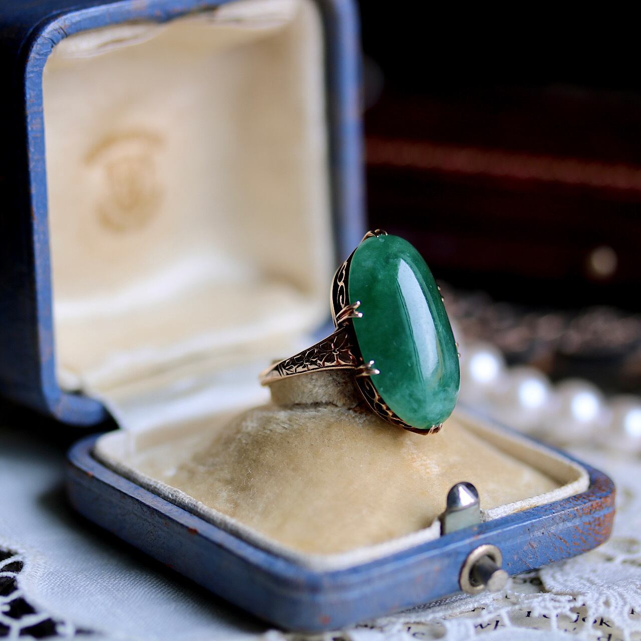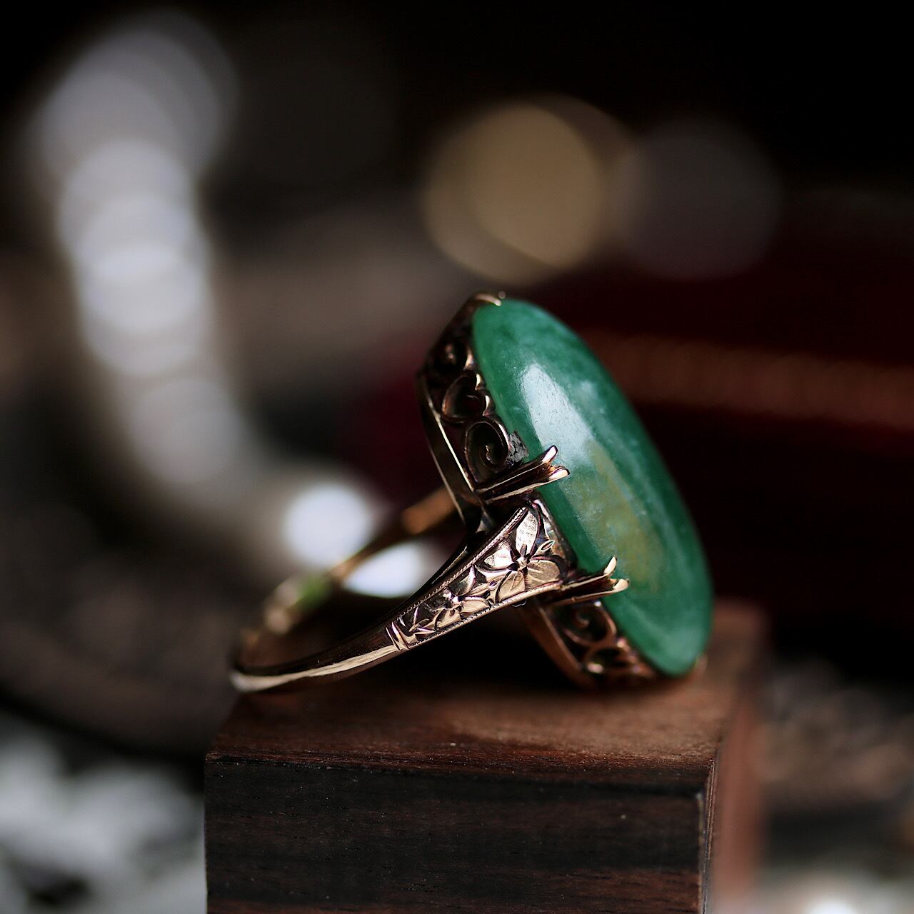 大粒翡翠のK14和彫ヴィンテージリング。