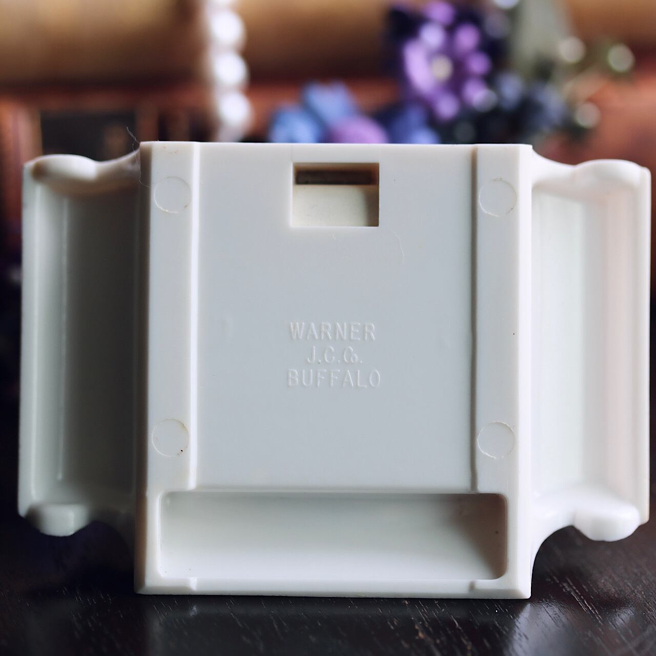 ホワイト色のベークライト製ケースにアイボリーのグログランにパープルのベルベットクッション。