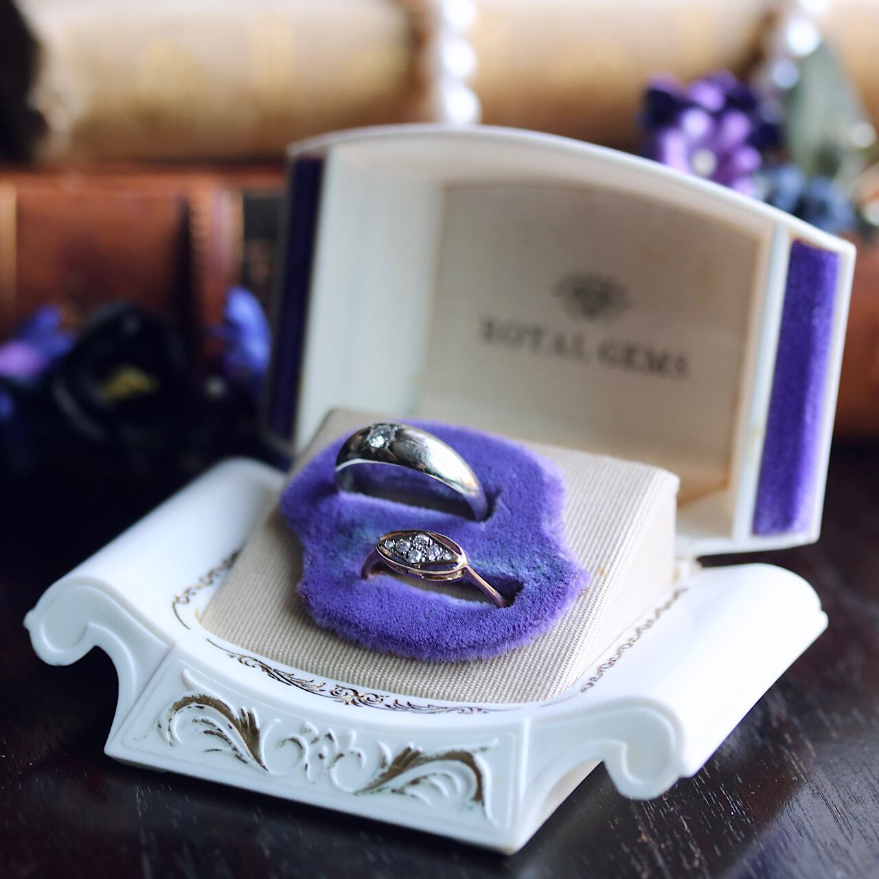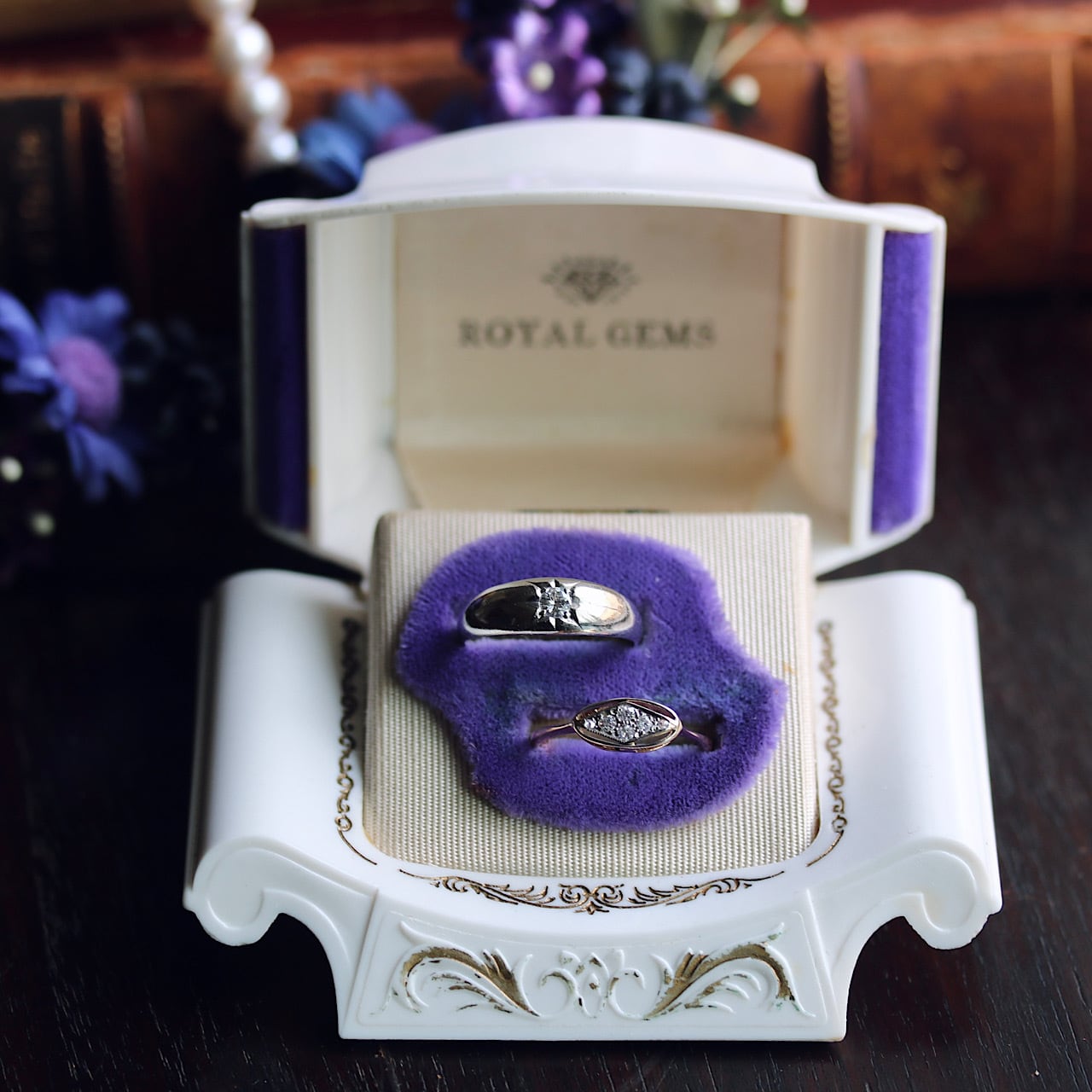 金のエンボス装飾、ホワイト× パープルの組み合わせがエレガントなリングボックスです。