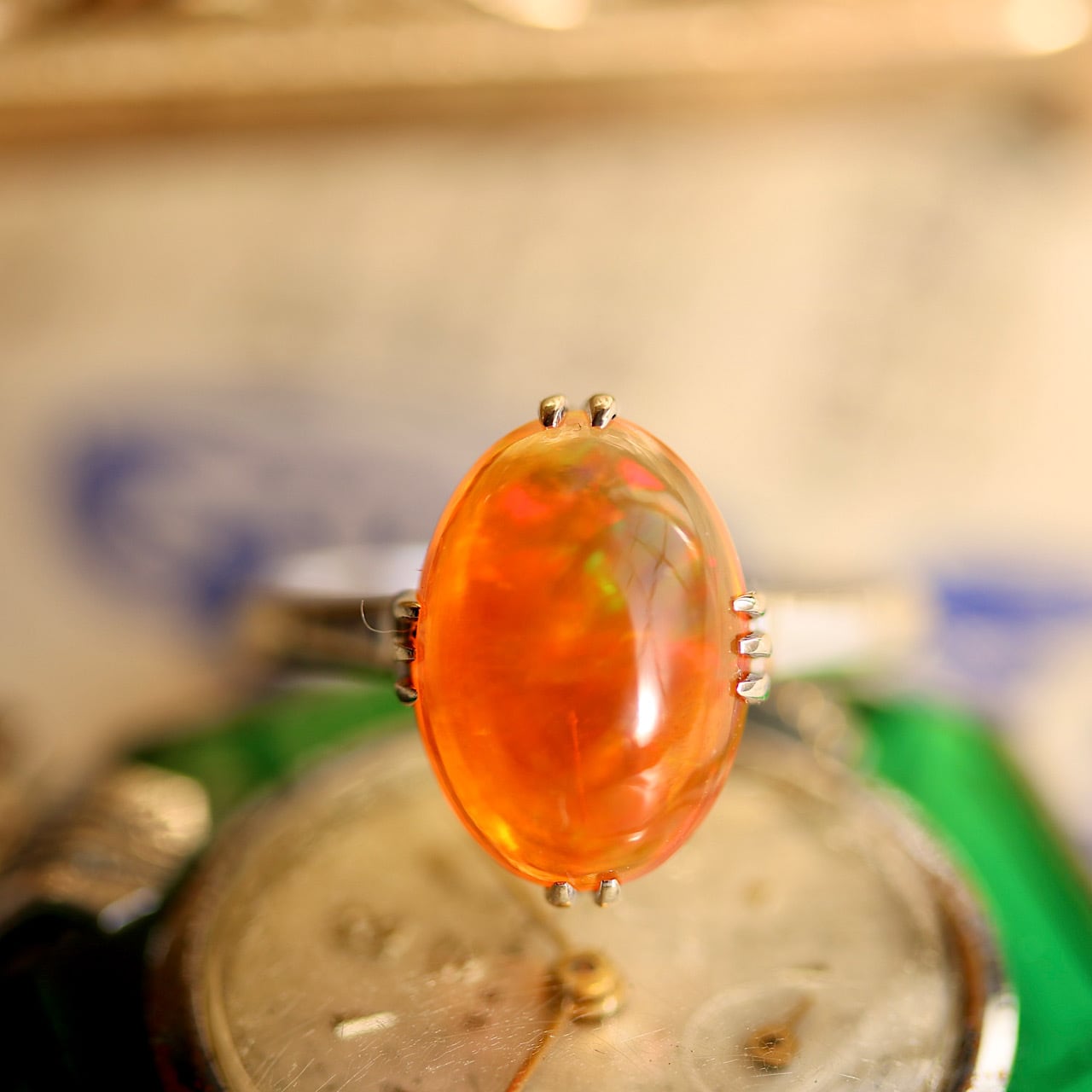 透明感がありつつ濃いオレンジの地色に虹色の遊色効果が現れ、傾けるたびに表情を変えてくれる、ずっと見ていられる程に美しいオパールです。