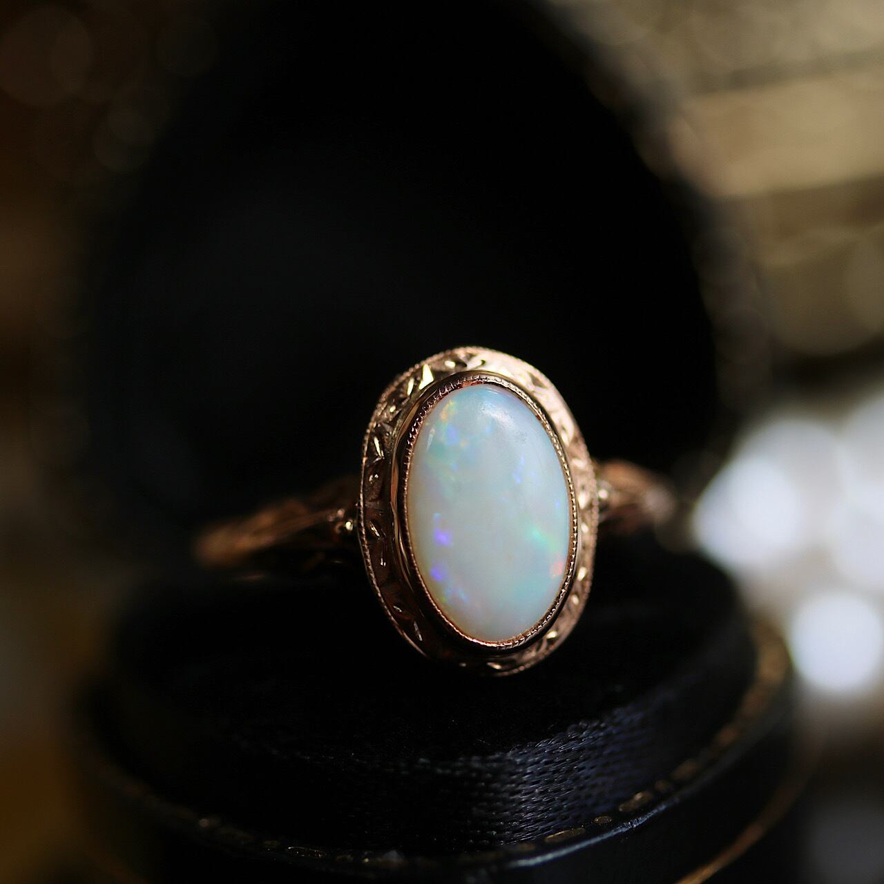 淡いミルキー色のオパールと繊細な彫金とが合わさり、品良く可憐な女性らしいリングとなっております。