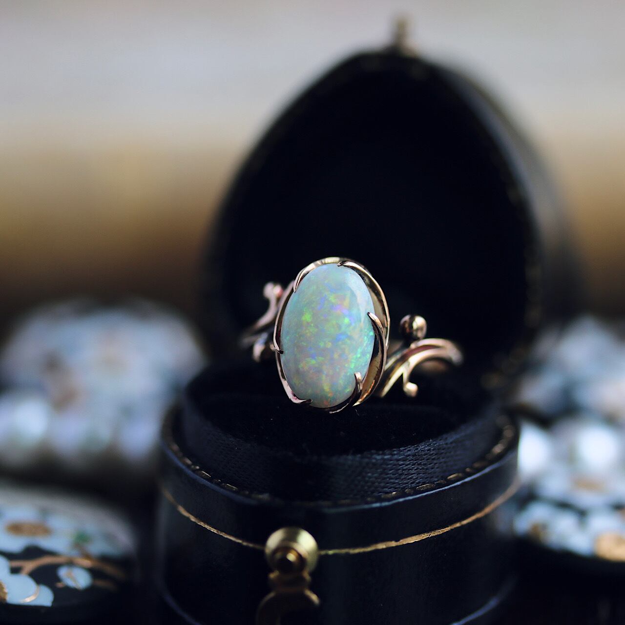 オパールの美しさを引き立てる捻り梅にアール・ヌーヴォー調のアームデザインと合わさる事で、更に美しさが増しているように感じます。