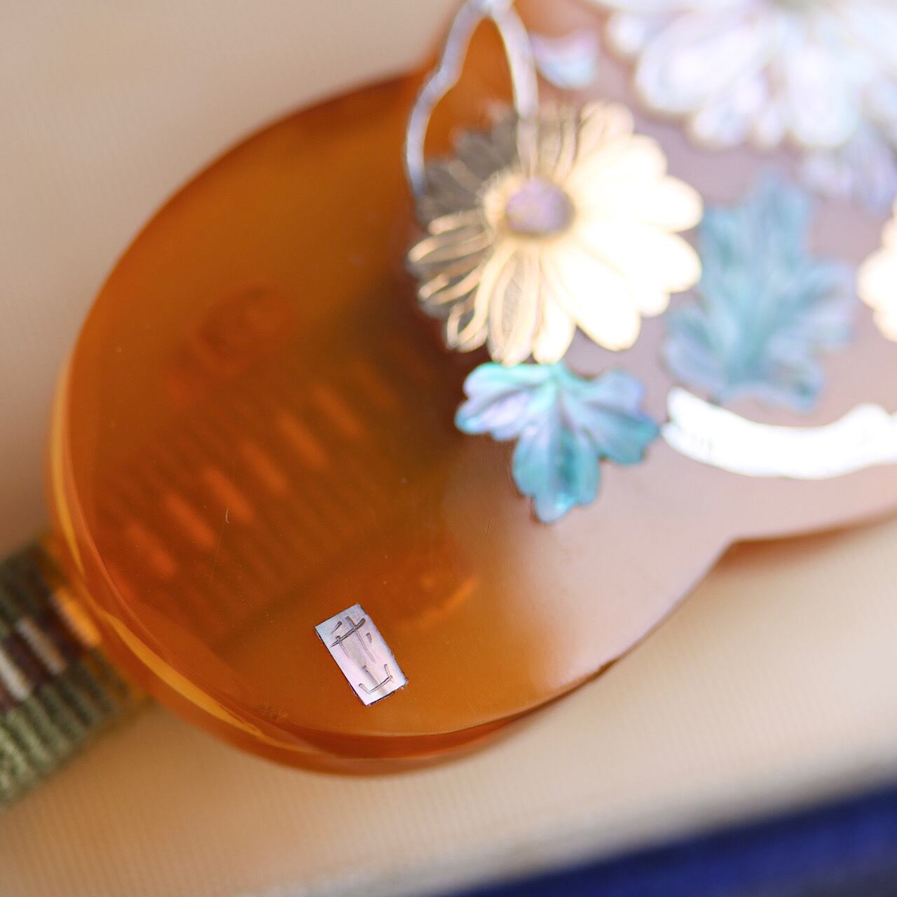 貝のパーツは立体感がありますが、18金や銀の嵌め込み部分は凹凸がなく、ピッタリと嵌め込まれている為、指で触っても全く分からない程。