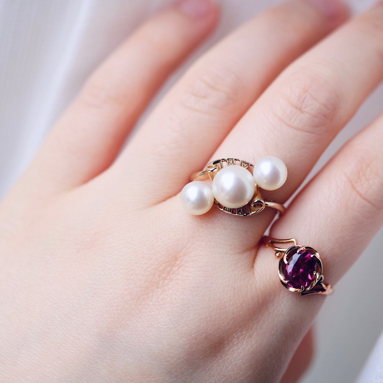 中心の真珠は、脇の真珠と比べると少し大きくなっており、後ろには装飾が施された薄い金の板が添えられた、一風変わった斬新なデザイン。