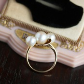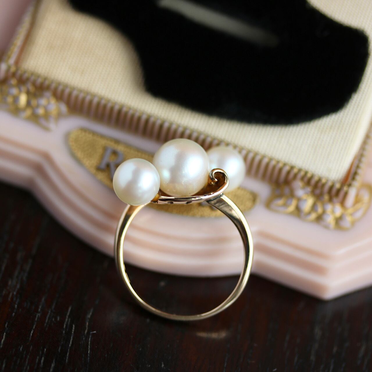 真珠3つを斜めにセッティングしたアールデコらしい雰囲気のリングです。