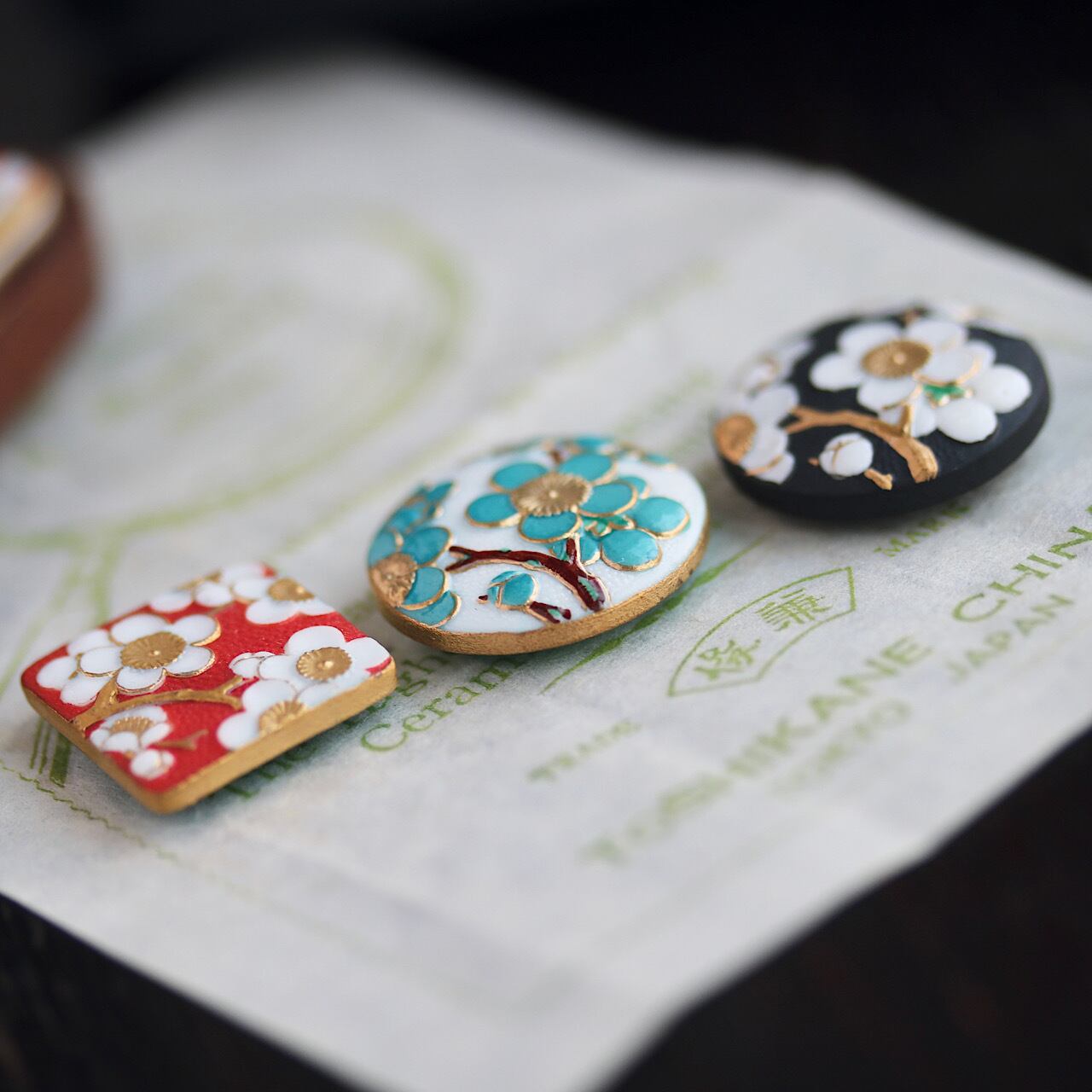 こちらは白地の丸いボタンに青緑色の梅の花が描かれており、裏面は淡い青緑色になります。