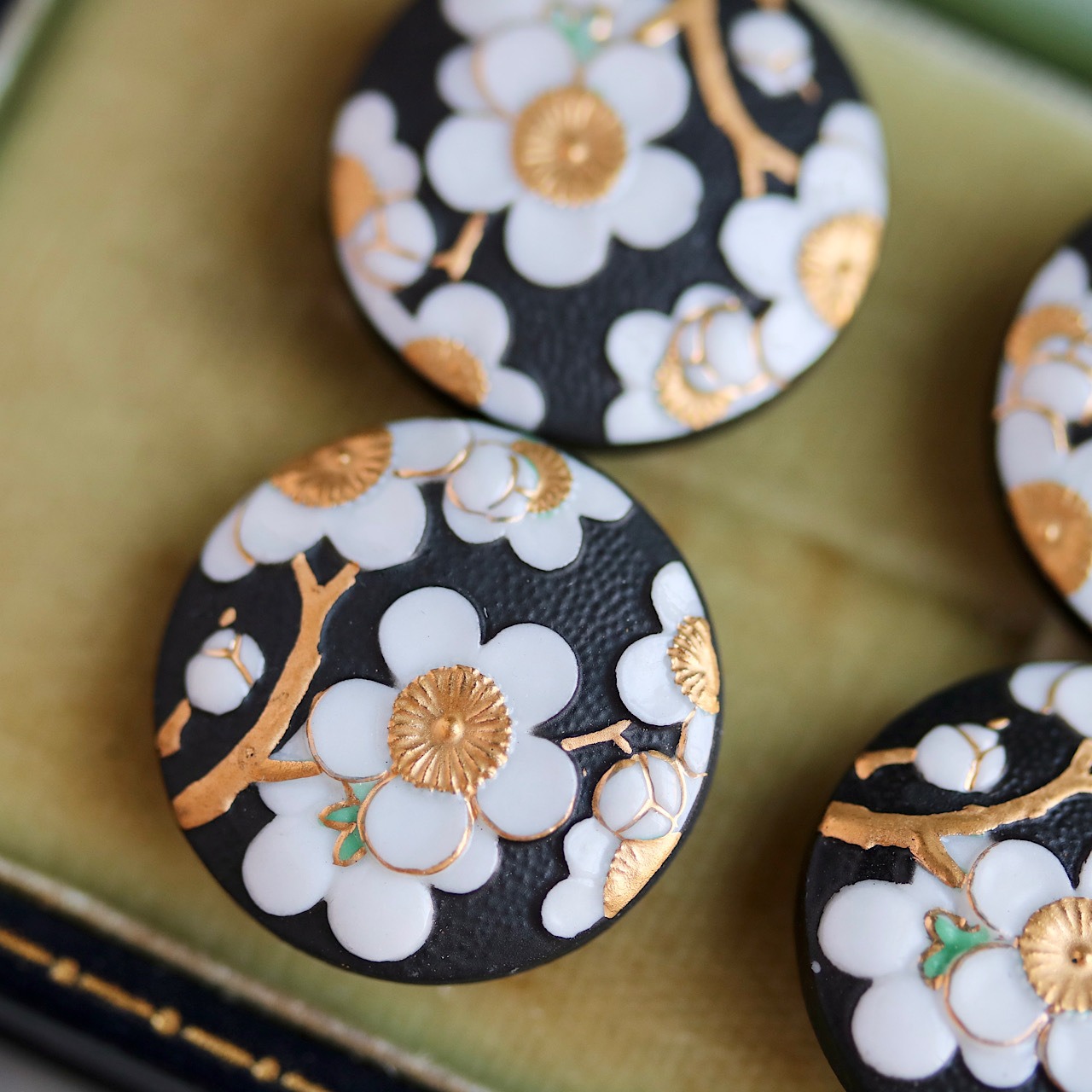 黒地のボタンに描かれているため、梅の花や金彩がよく映え、絵付けの美しさが際立つ作品です。