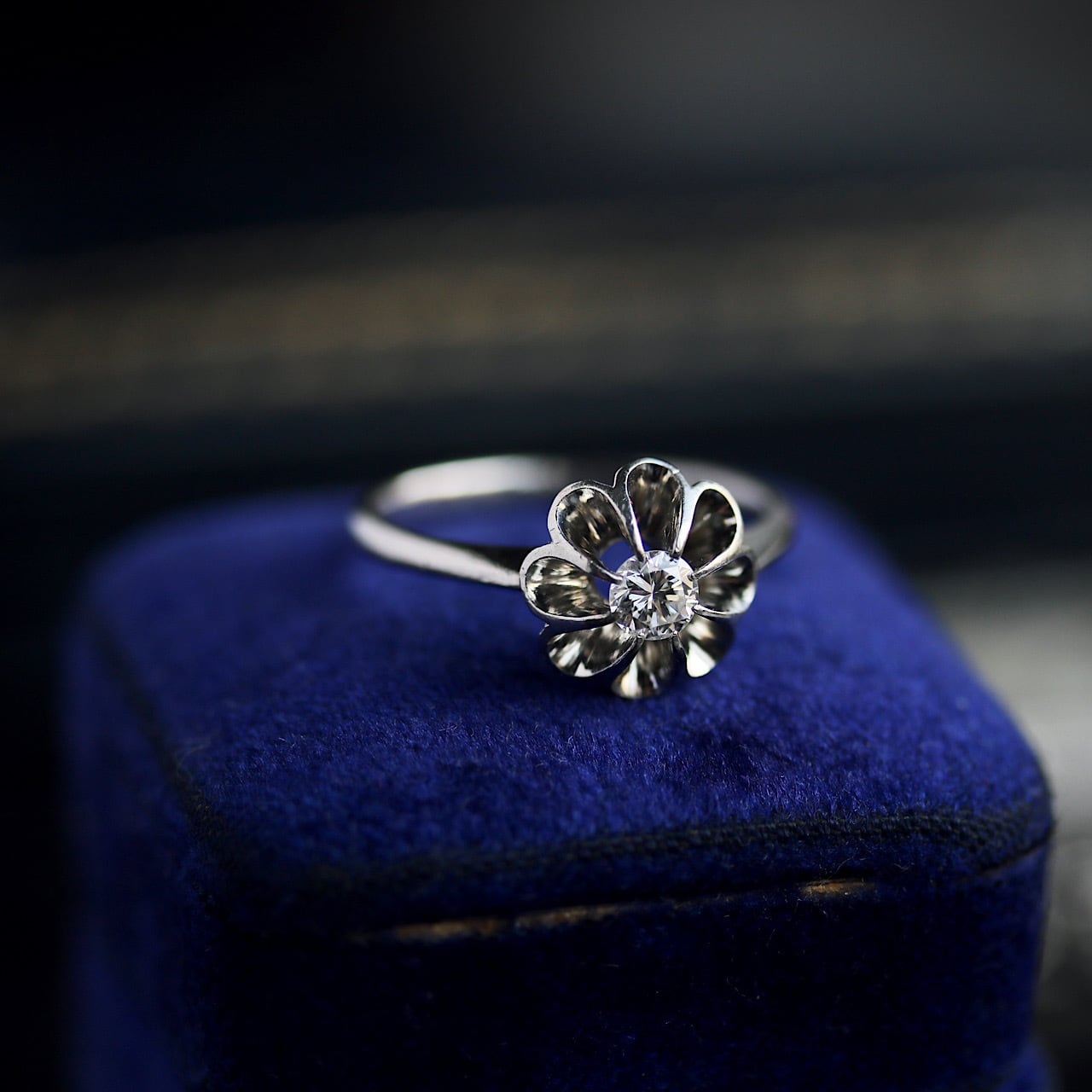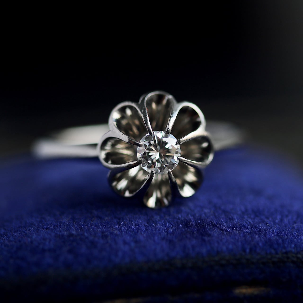 P.m刻印 プラチナ製のダイヤモンド菊爪のヴィンテージリング。