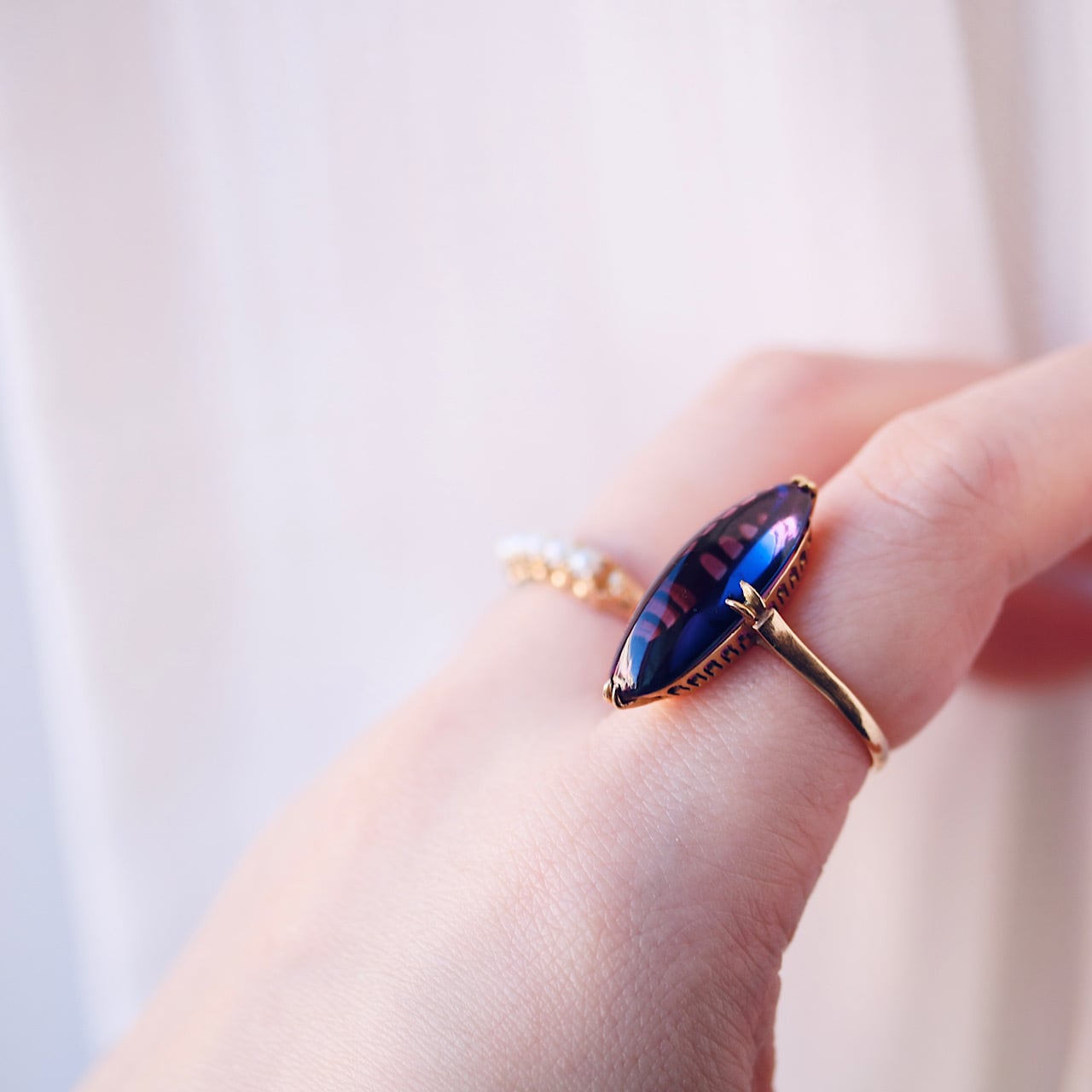 瑞々しい葡萄を連想させるようなカボションカットで、こっくりとした深いパープル色が魅力的なリングです。