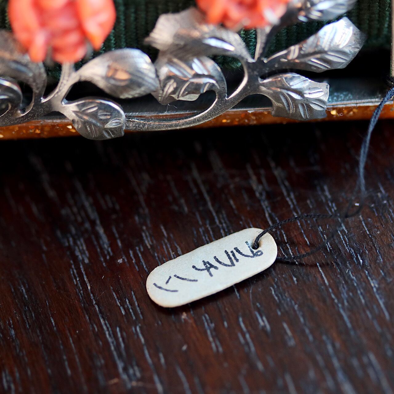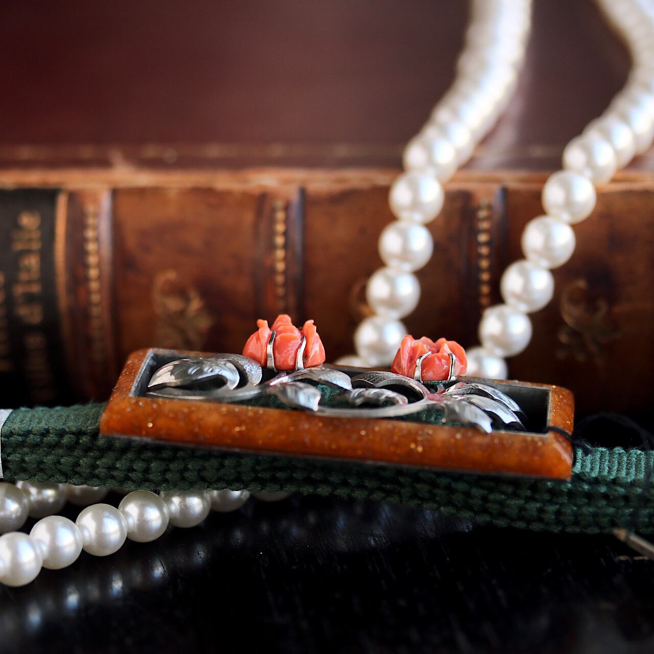 薔薇の花は珊瑚で表現されており、お洒落な彫金の葉や茎が目を引く逸品です。