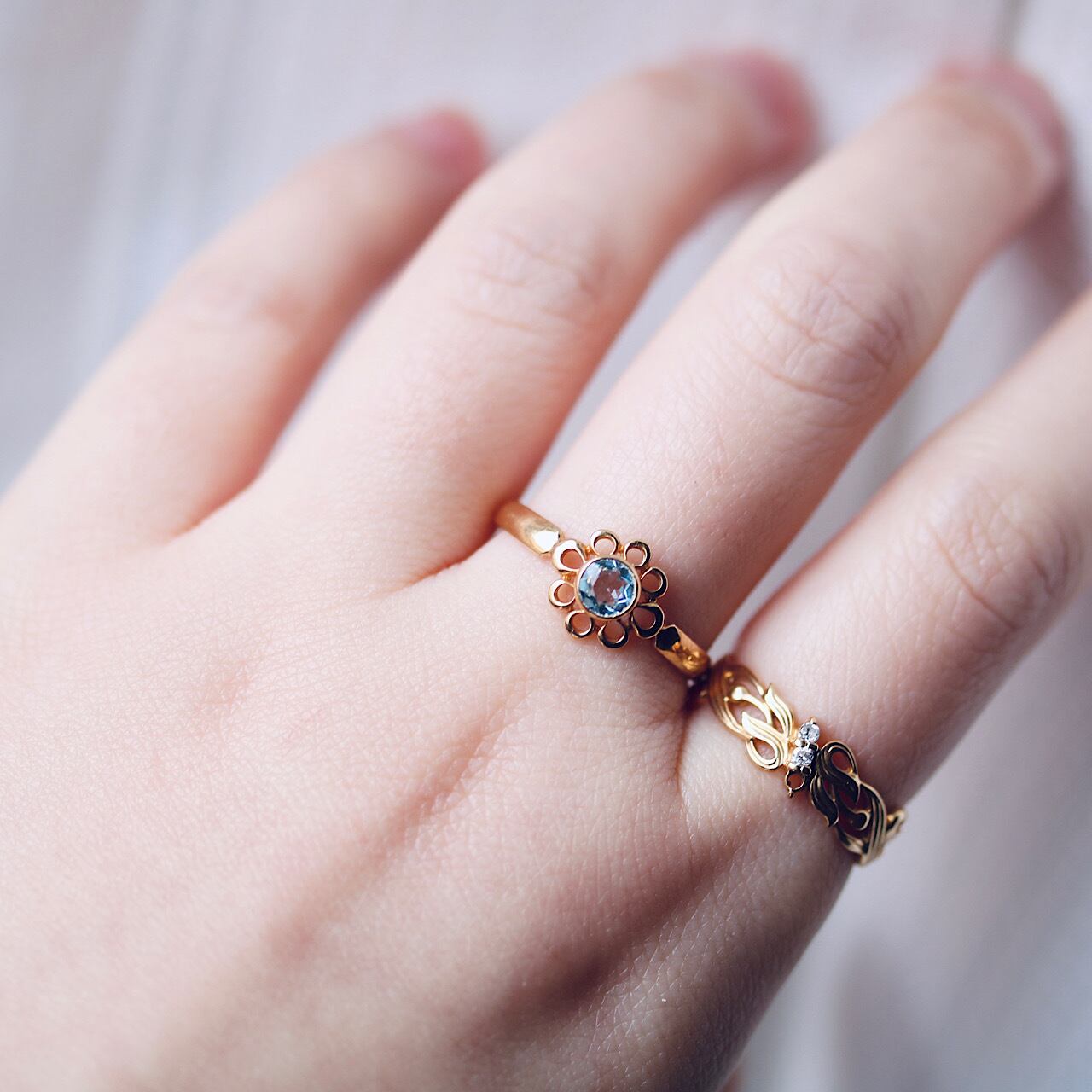 K18 天然アクアマリンのクラシカルなお花のヴィンテージリング。