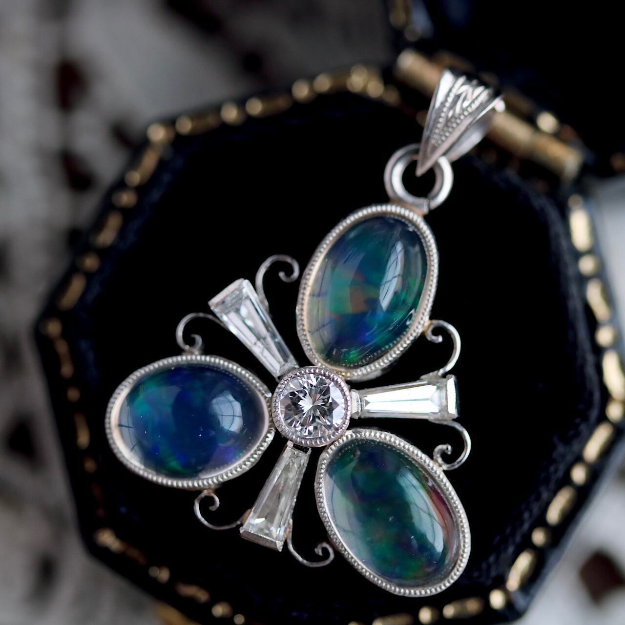 P.m刻印 プラチナ製、ウォーターオパールとダイヤモンドのアールデコペンダントトップ。