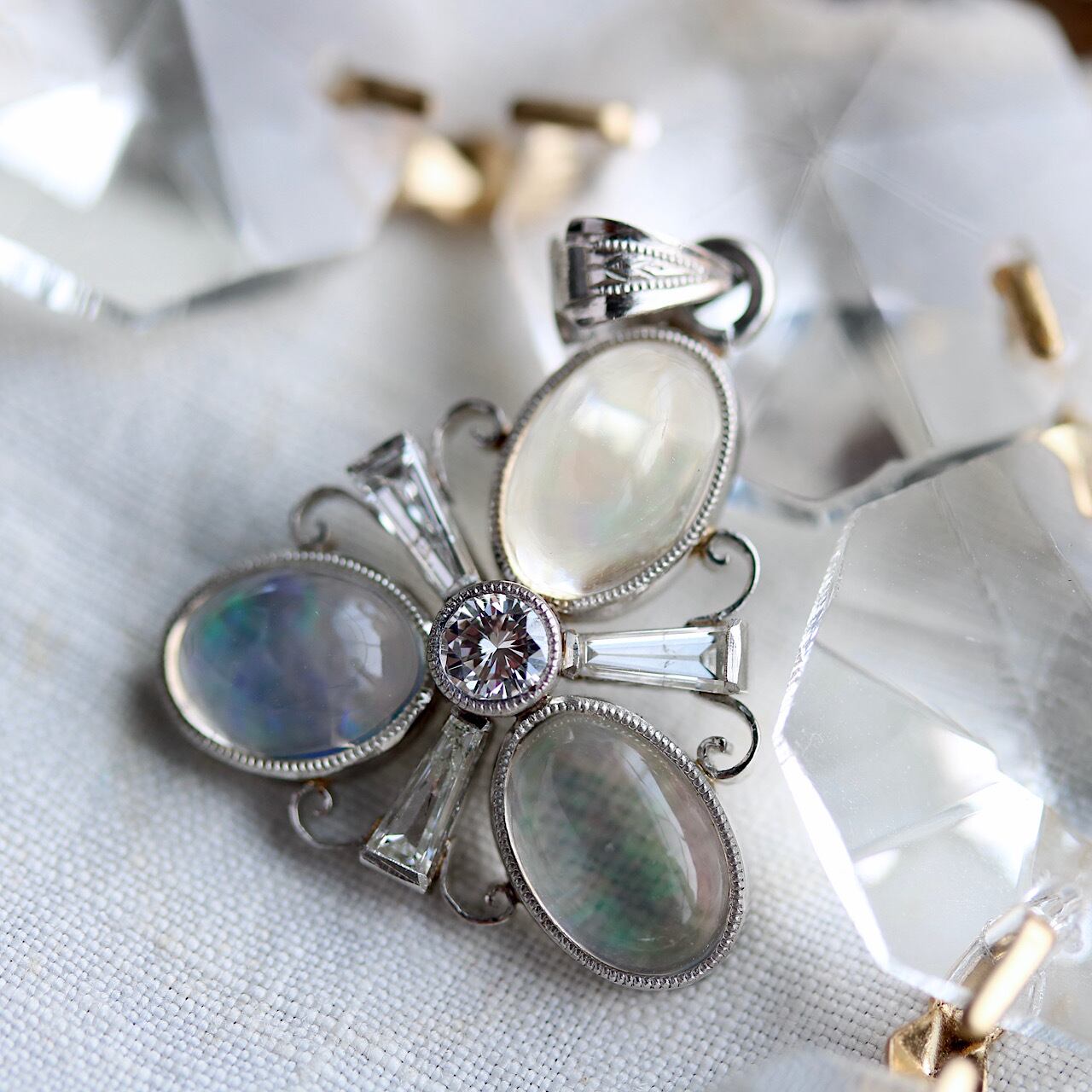 プラチナ台にクリアなウォーターオパールと無色ダイヤモンドの組み合わせと、とことん透明感を意識した神秘的な雰囲気をも感じさせるペンダントトップ。