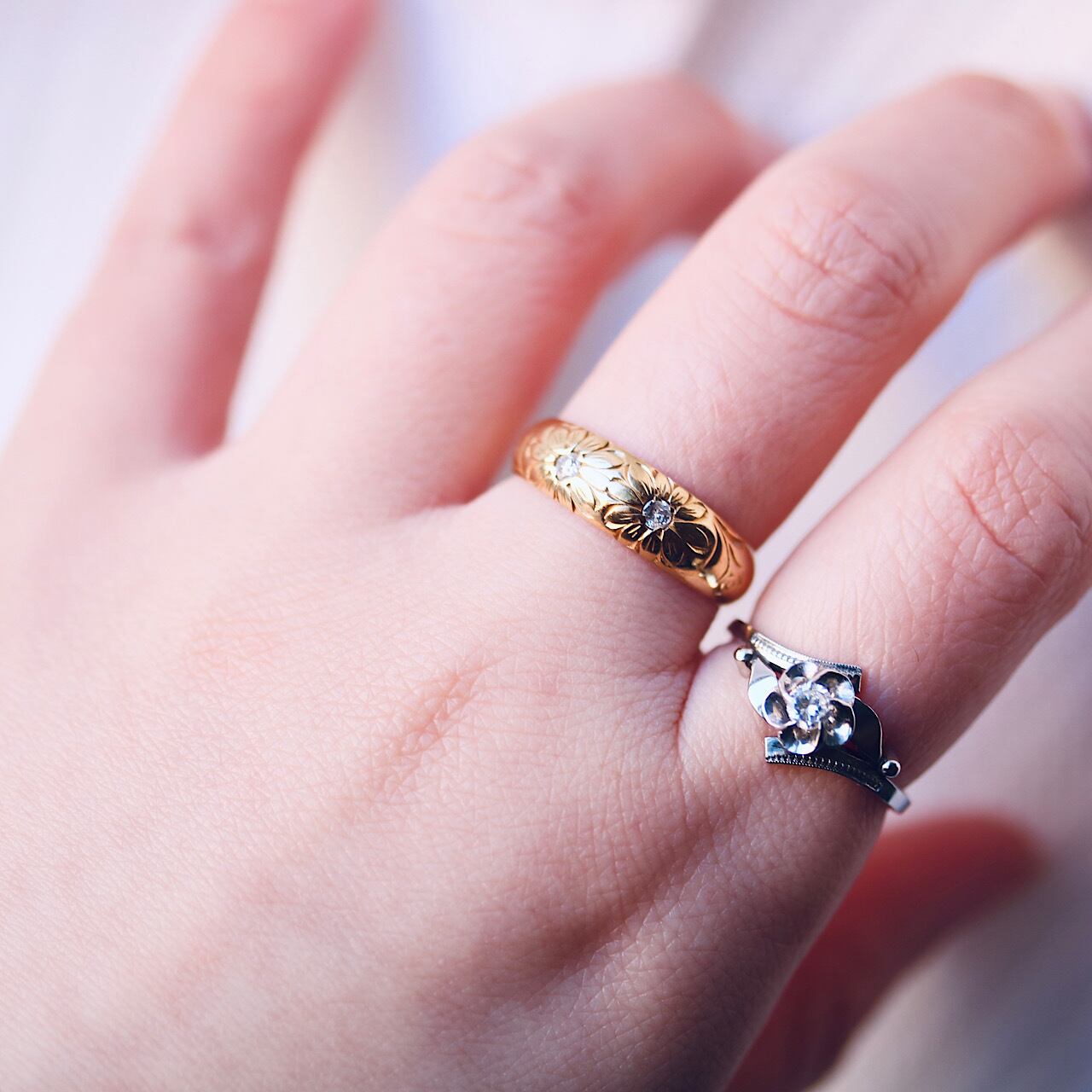 K18 ダイヤモンド2石 菊 和彫 甲丸 地金 ヴィンテージリング