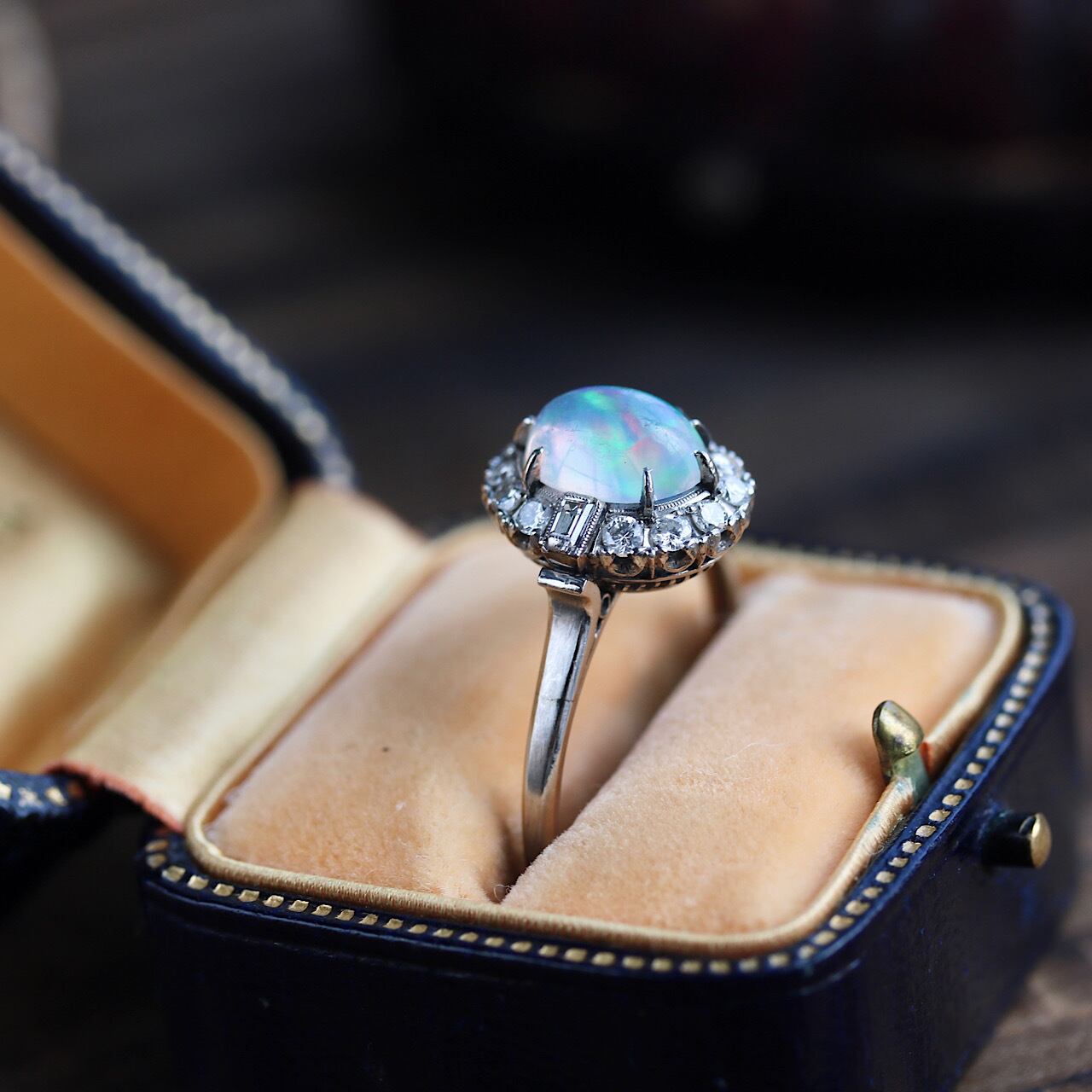 洗練されたデザインが美しい、プラチナ製のウォーターオパールとダイヤモンドのリング。