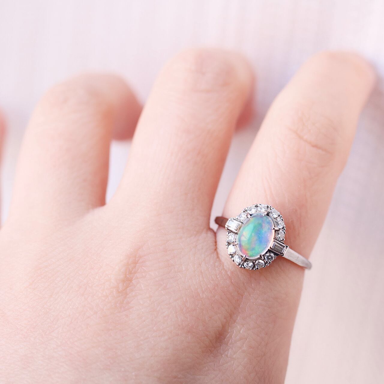 P.m刻印 プラチナ製 ウォーターオパール メレダイヤモンド取り巻きのヴィンテージリング。