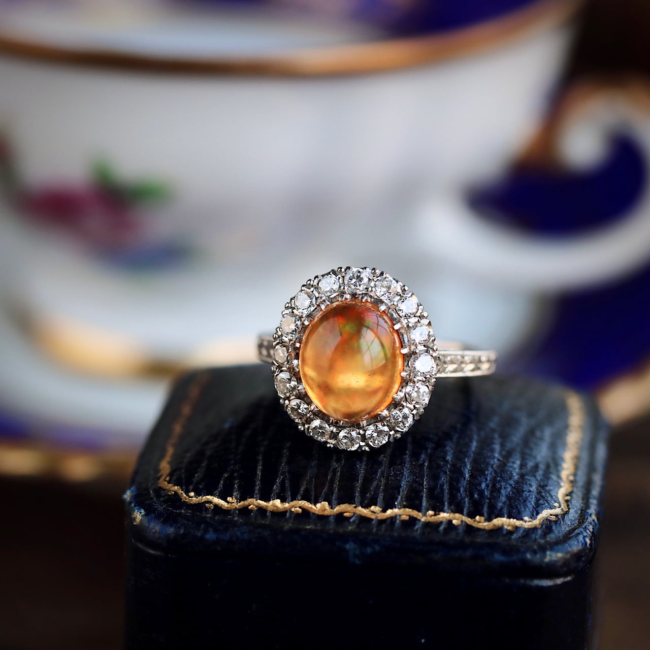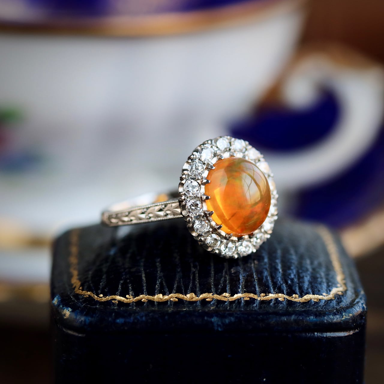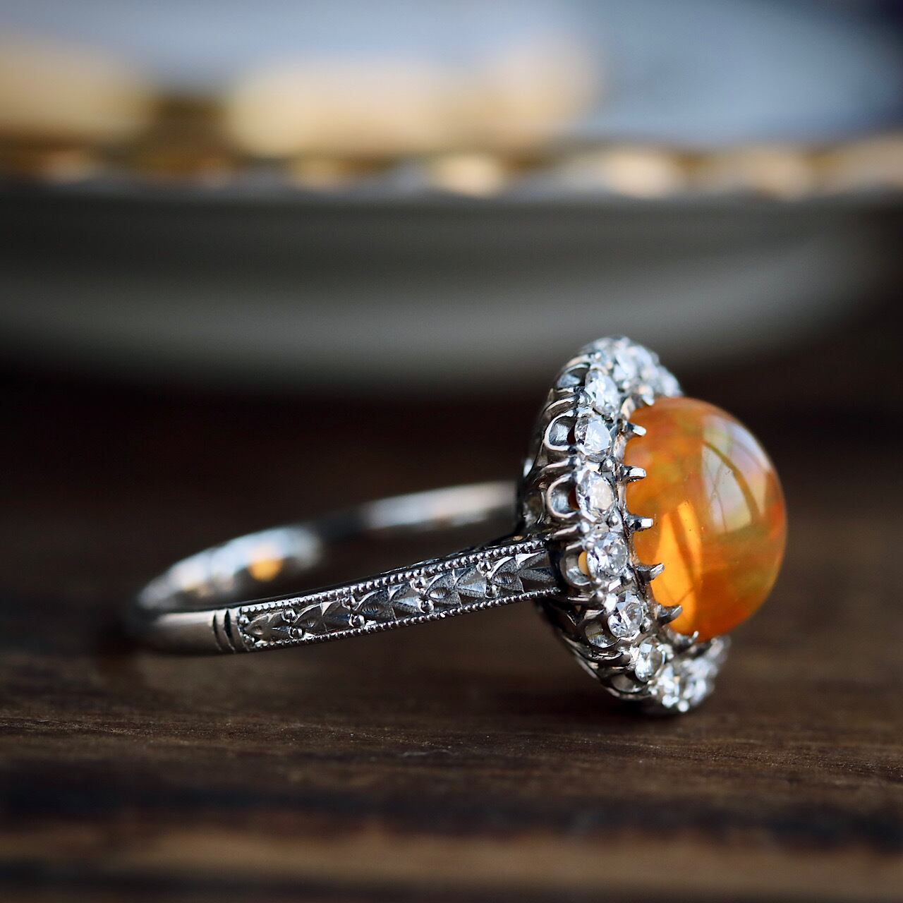 甘さと力強さを兼備したファイアオパールと、華やかなメレダイヤモンド取り巻きの組み合わせが印象的なヴィンテージリング。