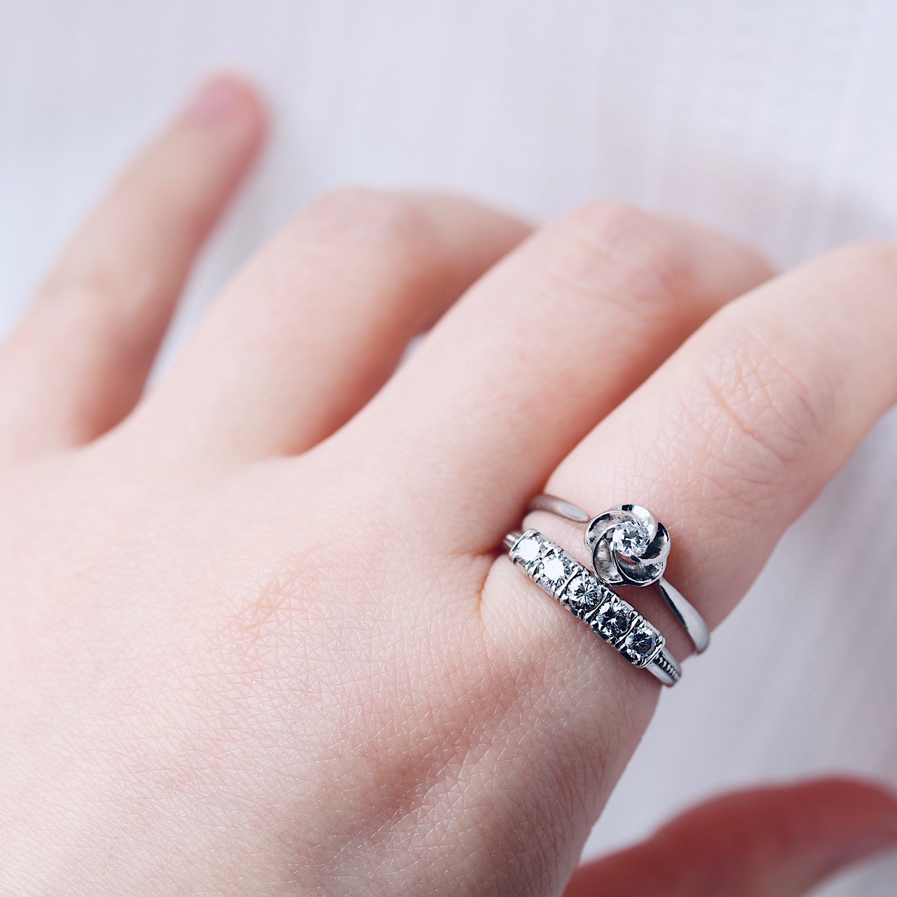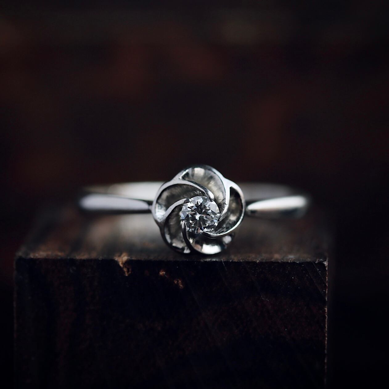 無色で輝きの綺麗なダイヤモンドが使用されており、特に捻り梅のセッティングは、裏側からも横からも光を取り込む事が出来る為、花弁を模した爪により光を反射させ、ダイヤモンドをより美しく魅力的に見せてくれます。