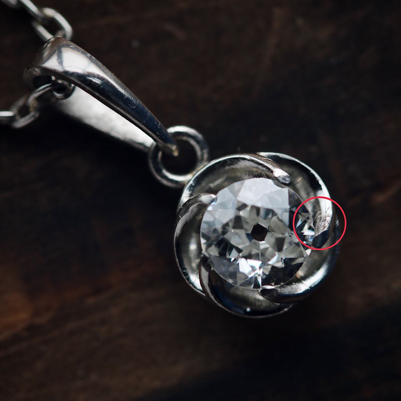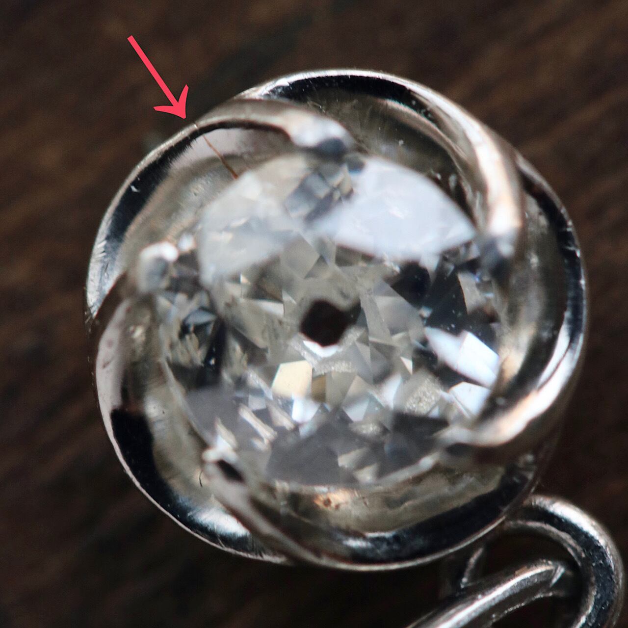 比較的綺麗な状態にはなりますが、ルーペ検品にて○印の箇所の地金に細かな浅い傷とほんの少しですがダイヤモンドの縁に傷があります。