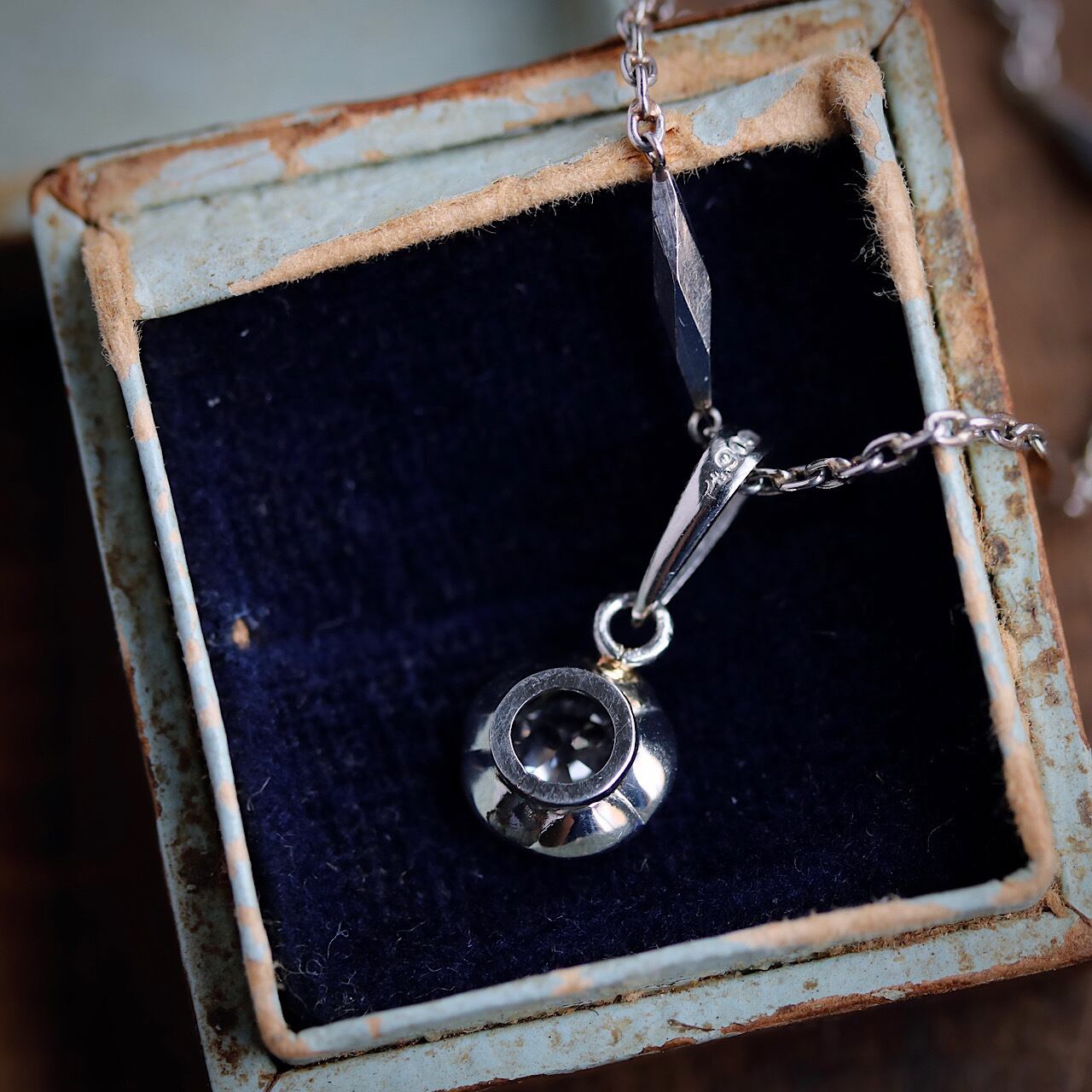 アンティークのダイヤモンドが使われている事や全体的な造り、金用のロウが使われている事から、まず古い時代の戦前のお品と思われますが、バチカンには比較的新しいプラチナ刻印が打たれていますので、打刻やバチカンの変更をした可能性があります。