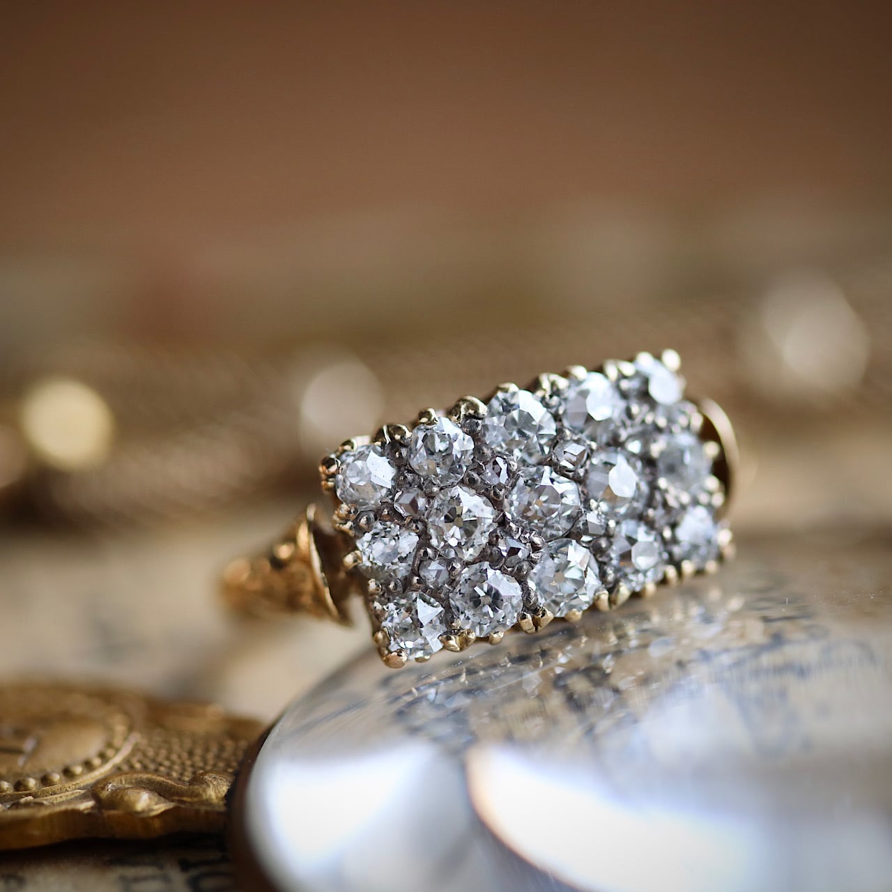 5粒のオールドヨーロピアンカットダイヤモンドが3列に並んだ贅沢なデザイン。