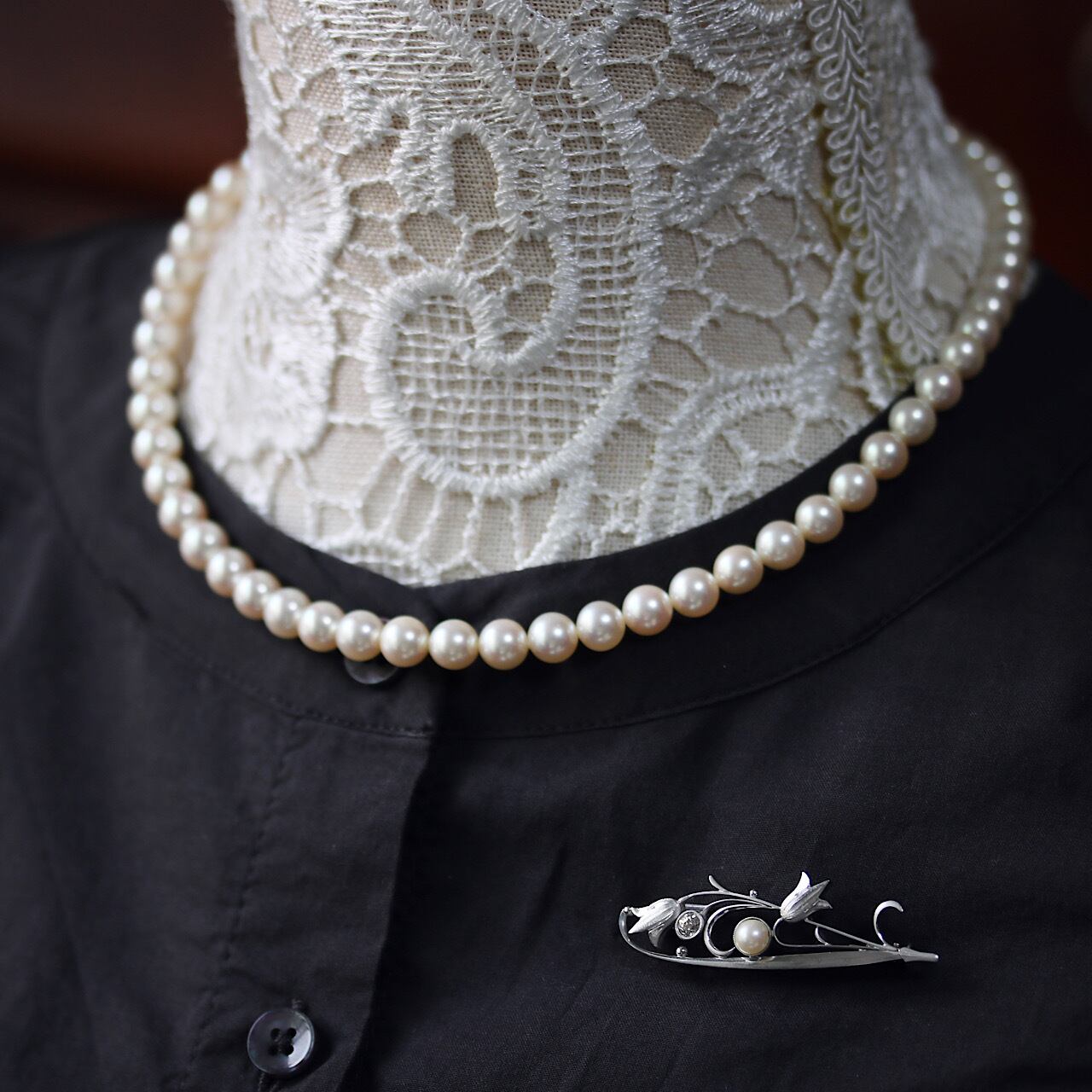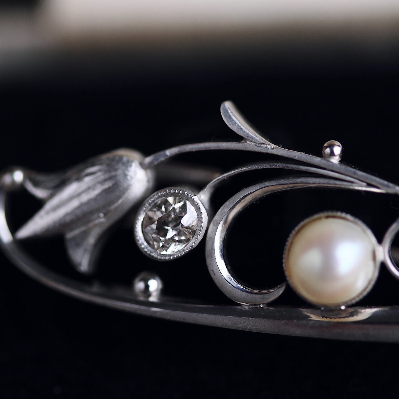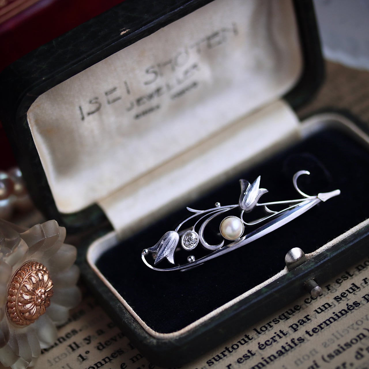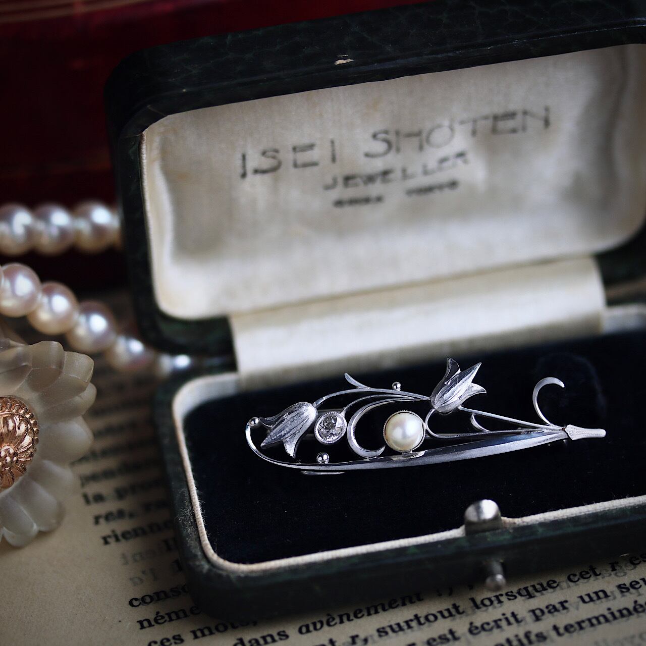 K14WG アンティークダイヤモンドと真珠 チューリップのアールヌーヴォーブローチ